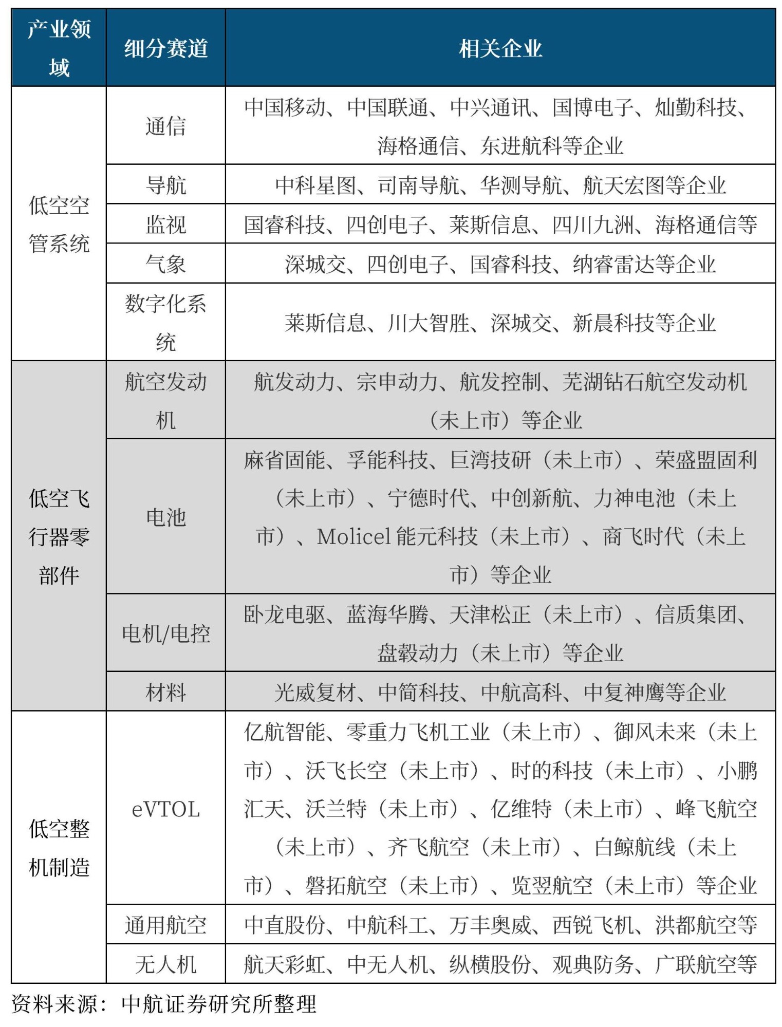 从投资层面来看,低空经济产业可分为三类主线,即低空空管系统、低空飞行器核心零部件及低空整机制造。中航证券对布局相关领域的企业进行了梳理: