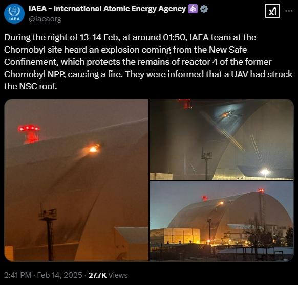 据报道,国际原子能机构称,当天1点50分左右,该机构驻切尔诺贝利核电站的团队注意到核电站的“新安全封隔”设施内传出爆炸声并引起火情,该设施负责保护切尔诺贝利核电站4号反应堆。据了解,一架无人机撞上了该设施顶部。