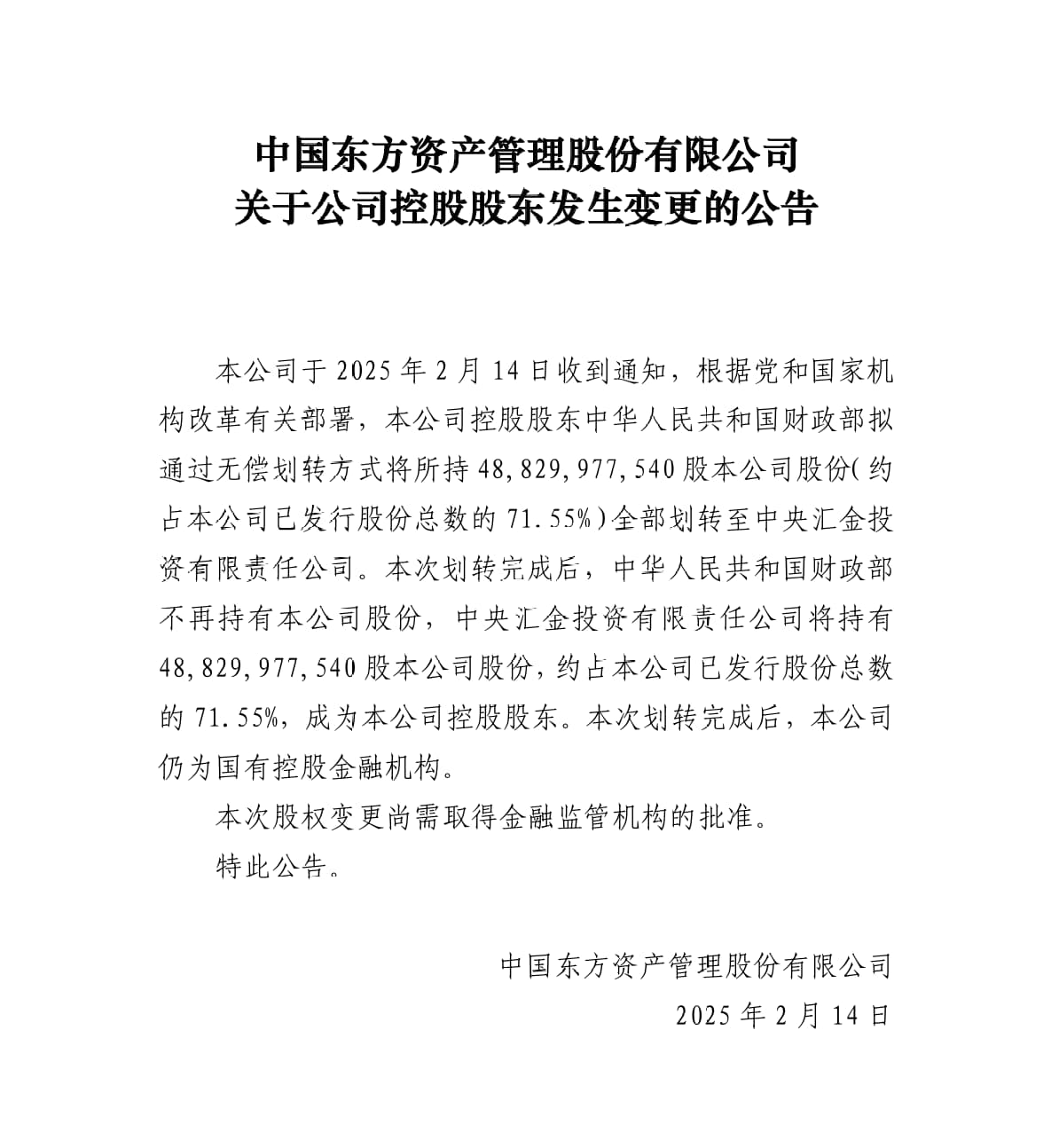 中国东方资产管理股份有限公司发布关于公司控股股东发生变更的公告称,公司于2025年2月14日收到通知,根据党和国家机构改革有关部署,本公司控股股东中华人民共和国财政部拟通过无偿划转方式将所持488.3亿股本公司股份(约占本公司已发行股份总数的71.55%)全部划转至中央汇金投资有限责任公司。
