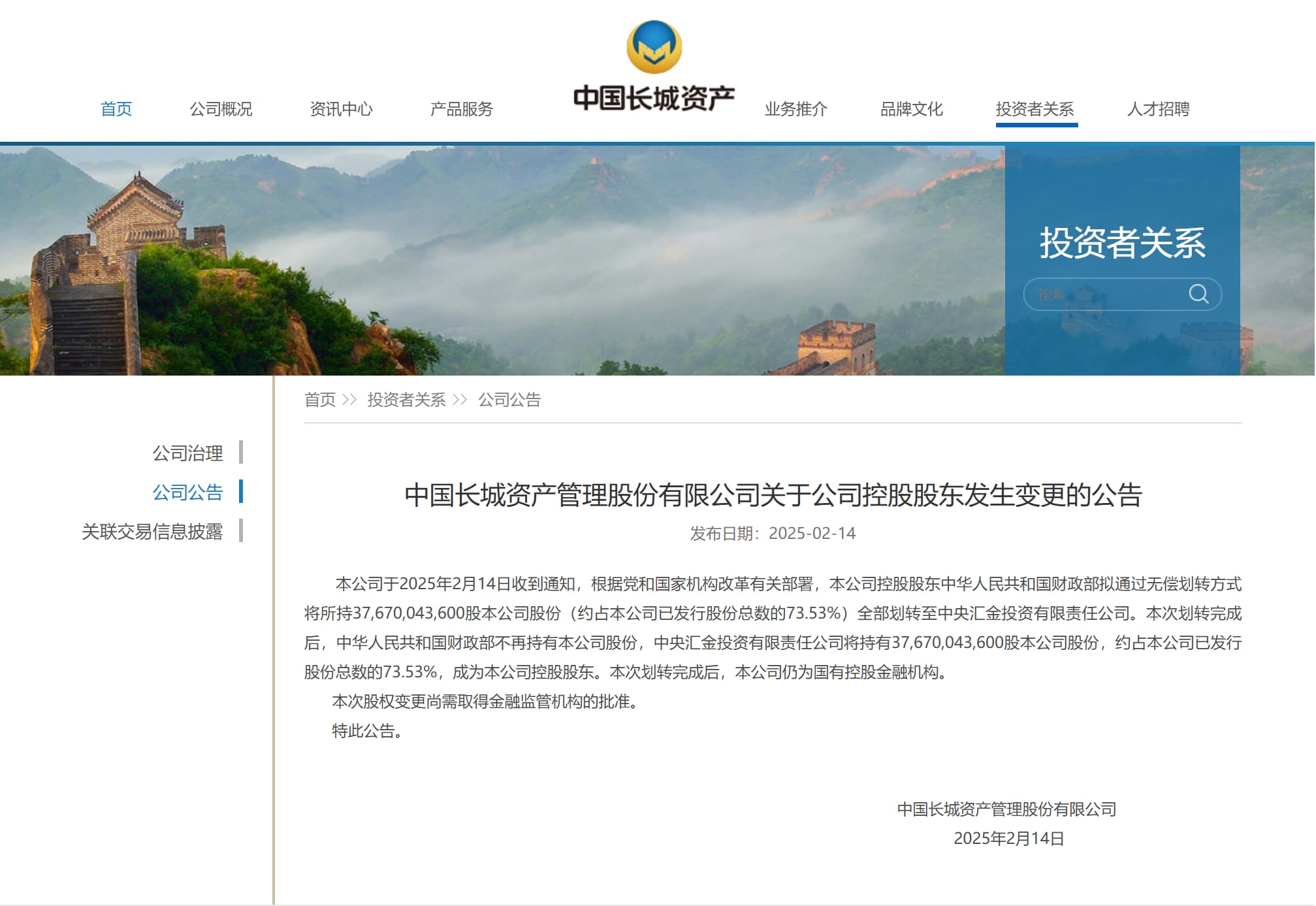 中国长城资产管理股份有限公司发布关于公司控股股东发生变更的公告称,公司于2025年2月14日收到通知,根据党和国家机构改革有关部署,本公司控股股东中华人民共和国财政部拟通过无偿划转方式将所持37,670,043,600股本公司股份(约占本公司已发行股份总数的73.53%)全部划转至中央汇金投资有限责任公司。