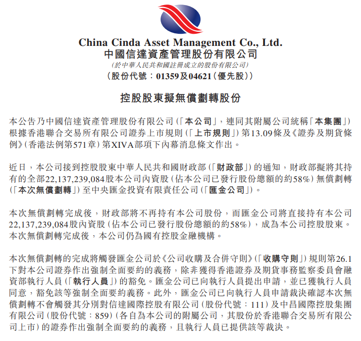中国信达在港交所公告称,近日接到控股股东财政部的通知,财政部拟将其持有的221.37亿股公司内资股(占公司已发行股份总额的约58%)无偿划转至中央汇金投资有限责任公司。无偿划转完成后,财政部将不再持有公司股份,汇金公司将直接持有公司221.37亿股内资股,成为公司控股股东。本次无偿划转完成后,公司仍为国有控股金融机构。