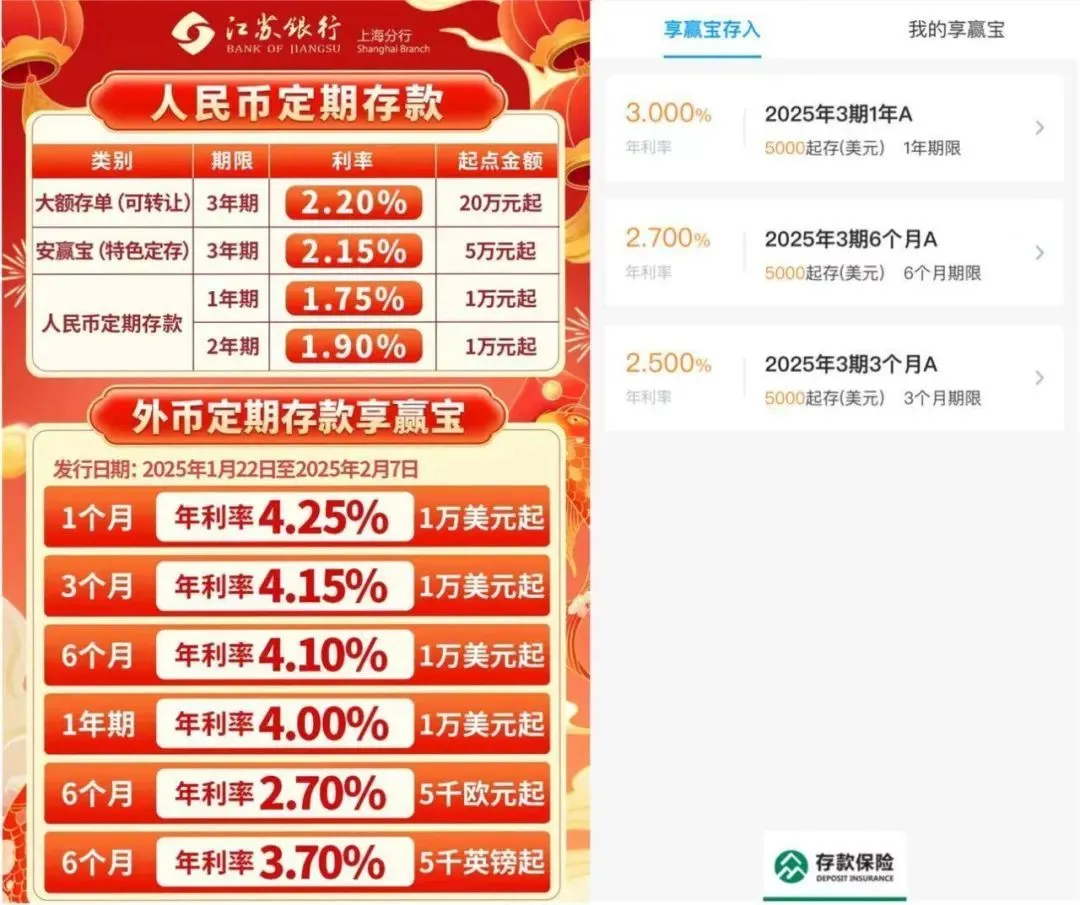 2月13日,江苏银行手机App显示,该行2025年第3期“享赢宝”3个月期、6个月期、1年期的年利率分别为2.5%、2.7%和3.0%,均为5000美元起存。据江苏银行客服介绍,2025年第3期“享赢宝”外币定期存款产品于2月9日发行。