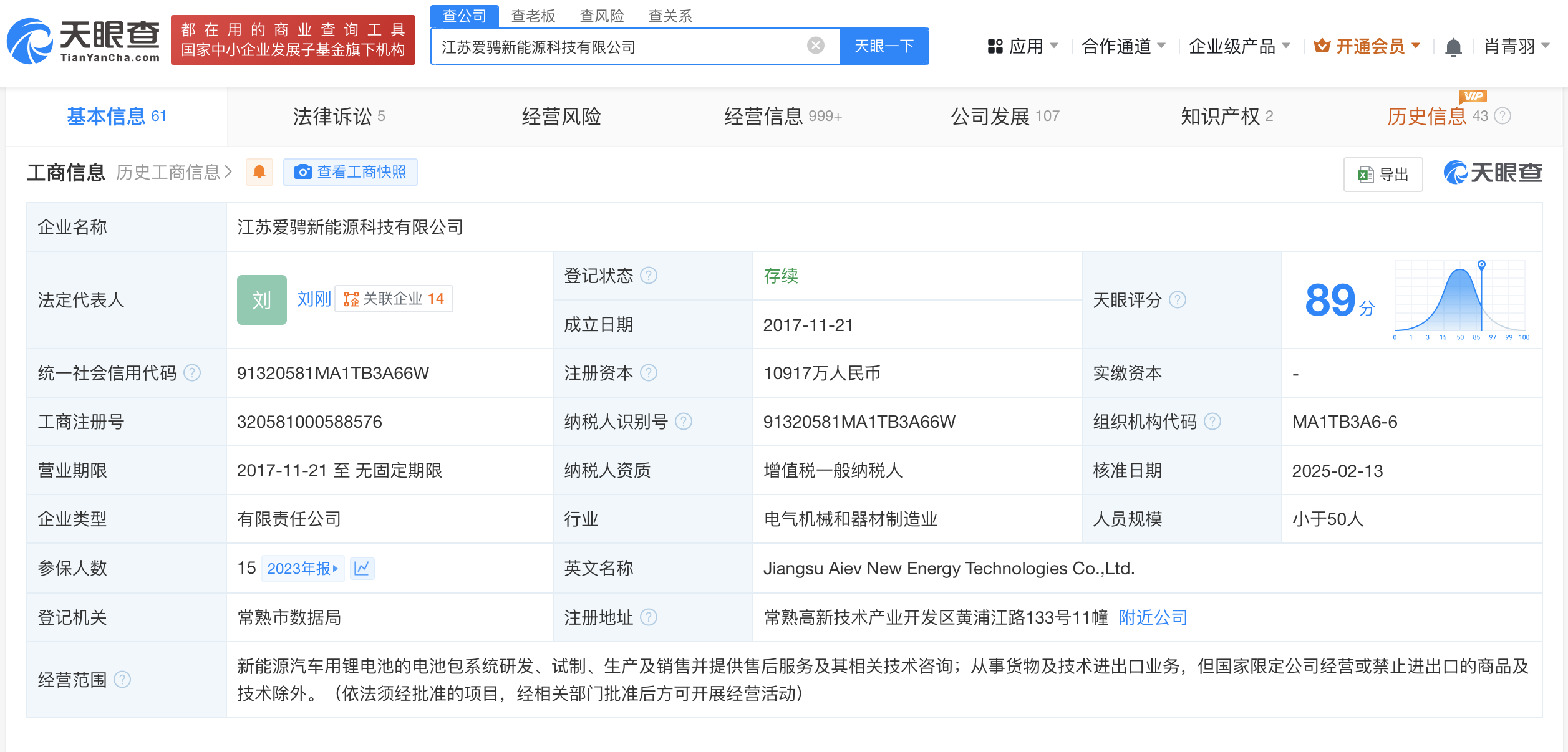 该公司成立于2017年11月,法定代表人为刘刚,经营范围包括新能源汽车用锂电池的电池包系统研发、试制、生产及销售并提供售后服务及其相关技术咨询等,由正力新能旗下苏州正力新能源科技有限公司、爱驰汽车有限公司共同持股。
