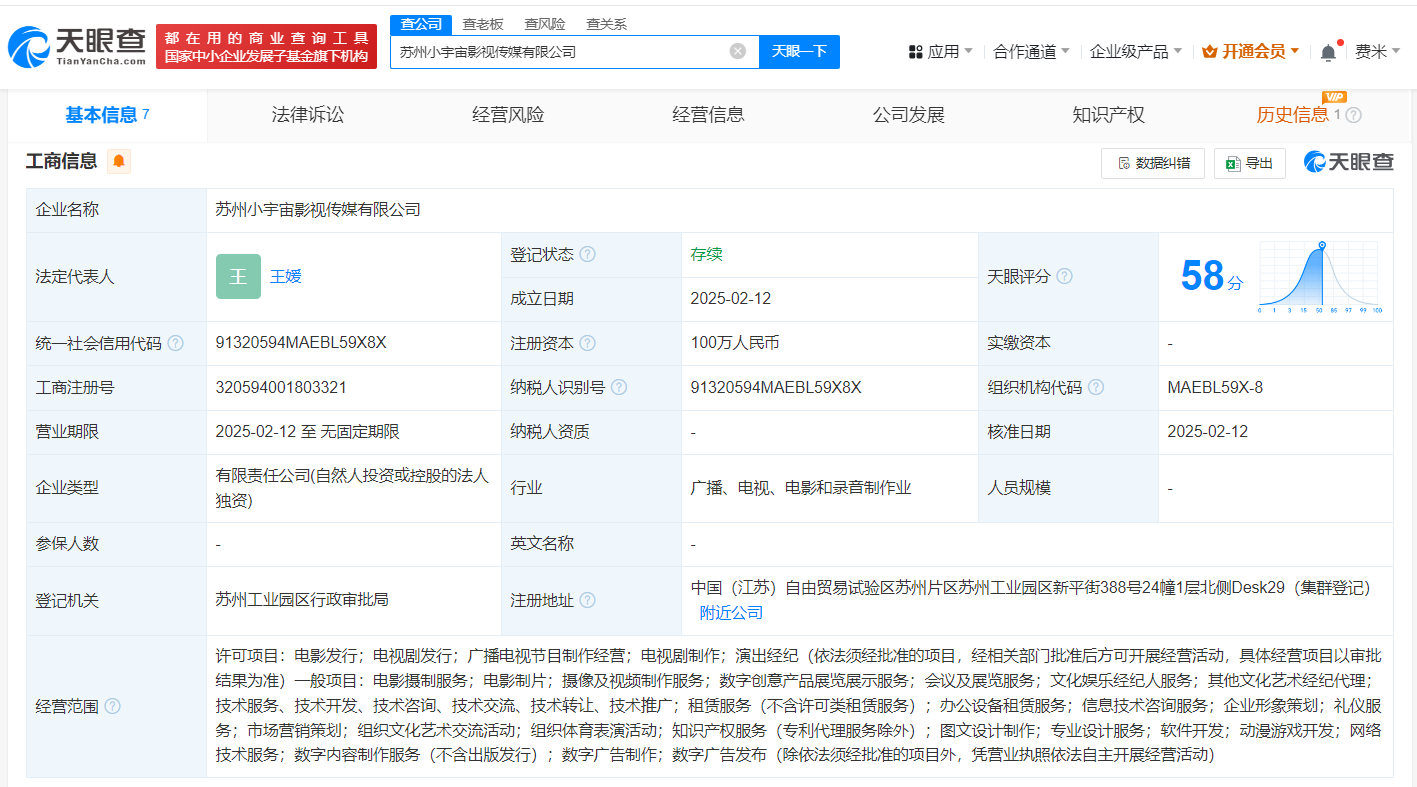 天眼查App显示,近日,苏州小宇宙影视传媒有限公司成立,法定代表人为王媛,注册资本100万人民币,经营范围含电影发行、电视剧发行、广播电视节目制作经营、电视剧制作、演出经纪等,由阿里影业旗下北京阿里淘影视文化有限公司全资持股。
