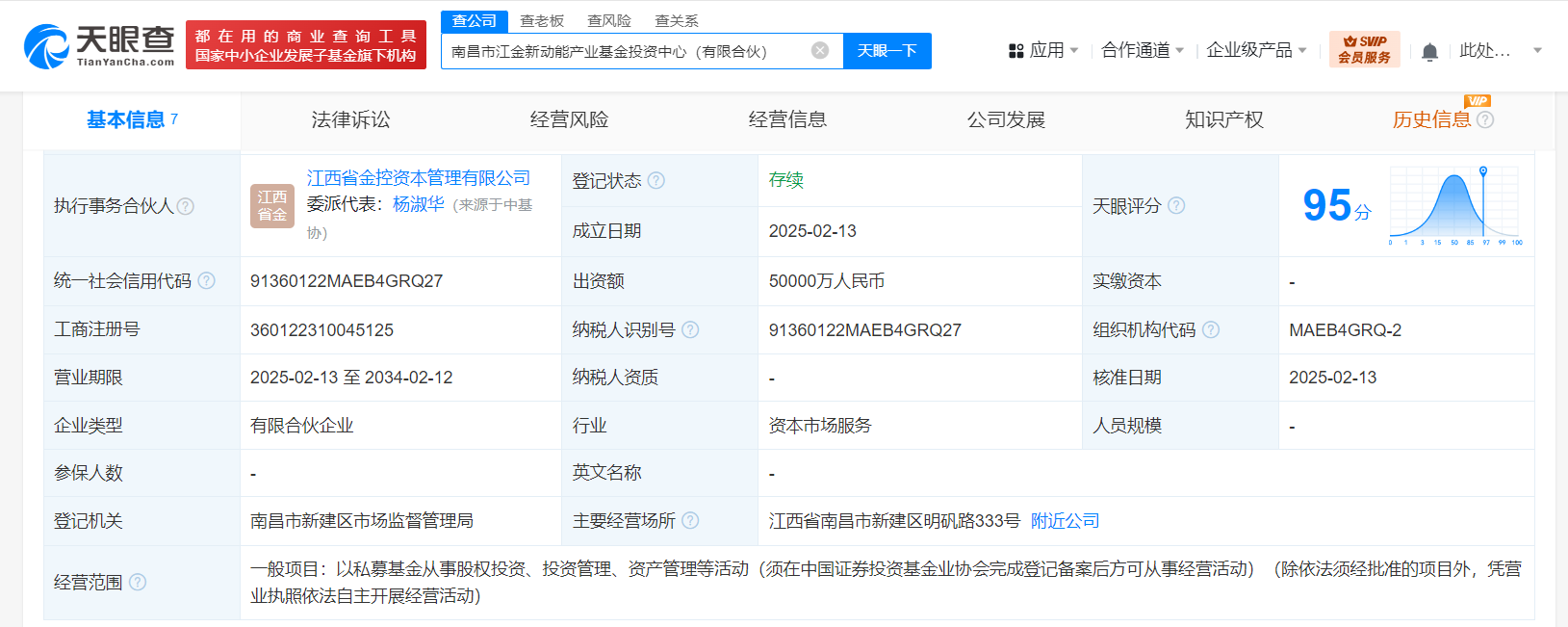 天眼查App显示,近日,南昌市江金新动能产业基金投资中心(有限合伙)成立,执行事务合伙人为江西省金控资本管理有限公司,出资额5亿人民币,经营范围含以私募基金从事股权投资、投资管理、资产管理等活动。合伙人信息显示,该合伙企业由江西省金控资本管理有限公司、江西省未来产业发展投资基金(有限合伙)、南昌市新建区天聚投资有限公司共同出资。