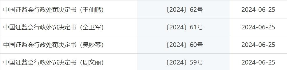 中国证监会于2024年6月25日披露的4份行政处罚决定书披露,涉及的4名被处罚人员分别是:时任杭州久胜私募基金管理有限公司执行总裁王仙鹏、荣盛控股全资子公司荣盛能源有限公司副总经理全卫军、浙江荣盛控股集团有限公司总裁办副主任吴妙琴、荣盛控股财务管理中心资金管理部门经理周文丽。
