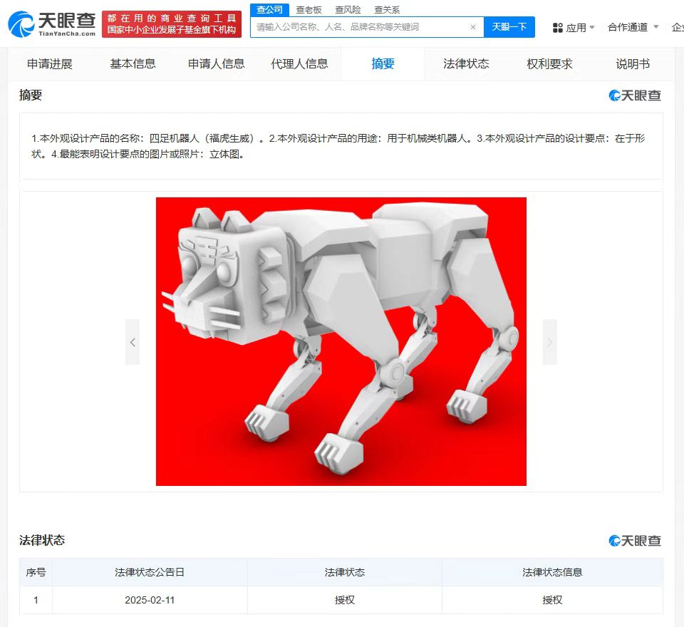 天眼查知识产权信息显示,近日,杭州宇树科技有限公司申请的“四足机器人(福虎生威)”外观专利获授权。摘要显示,该外观设计产品用于机械类机器人,其设计要点在于形状。