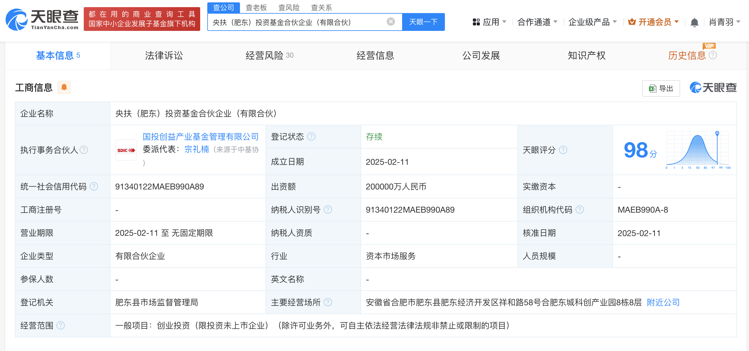 天眼查App显示,近日,央扶(肥东)投资基金合伙企业(有限合伙)成立,执行事务合伙人为国投创益产业基金管理有限公司,出资额20亿人民币,经营范围为创业投资。合伙人信息显示,该基金由合肥东城产业投资有限公司、中央企业乡村产业投资基金股份有限公司、国家开发投资集团有限公司旗下国投创益产业基金管理有限公司共同出资。