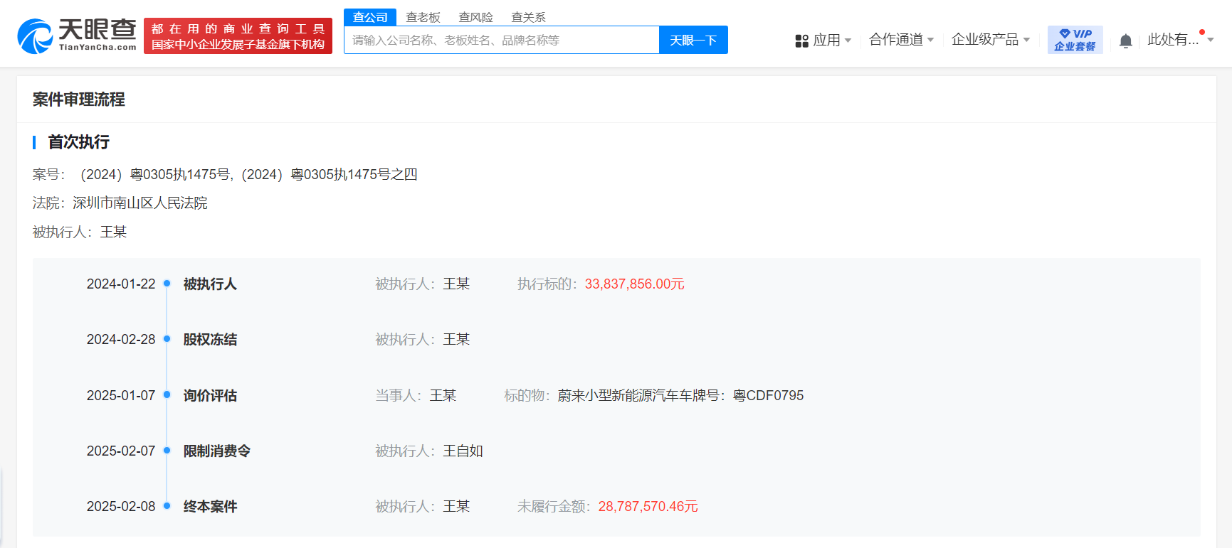 天眼查法律诉讼信息显示,近日,王自如新增一则终本案件信息,未履行金额2878万余元,案件流程信息显示,2024年1月,王自如因该案被强执3383万余元,今年2月7日,王自如因该案件被限制高消费。