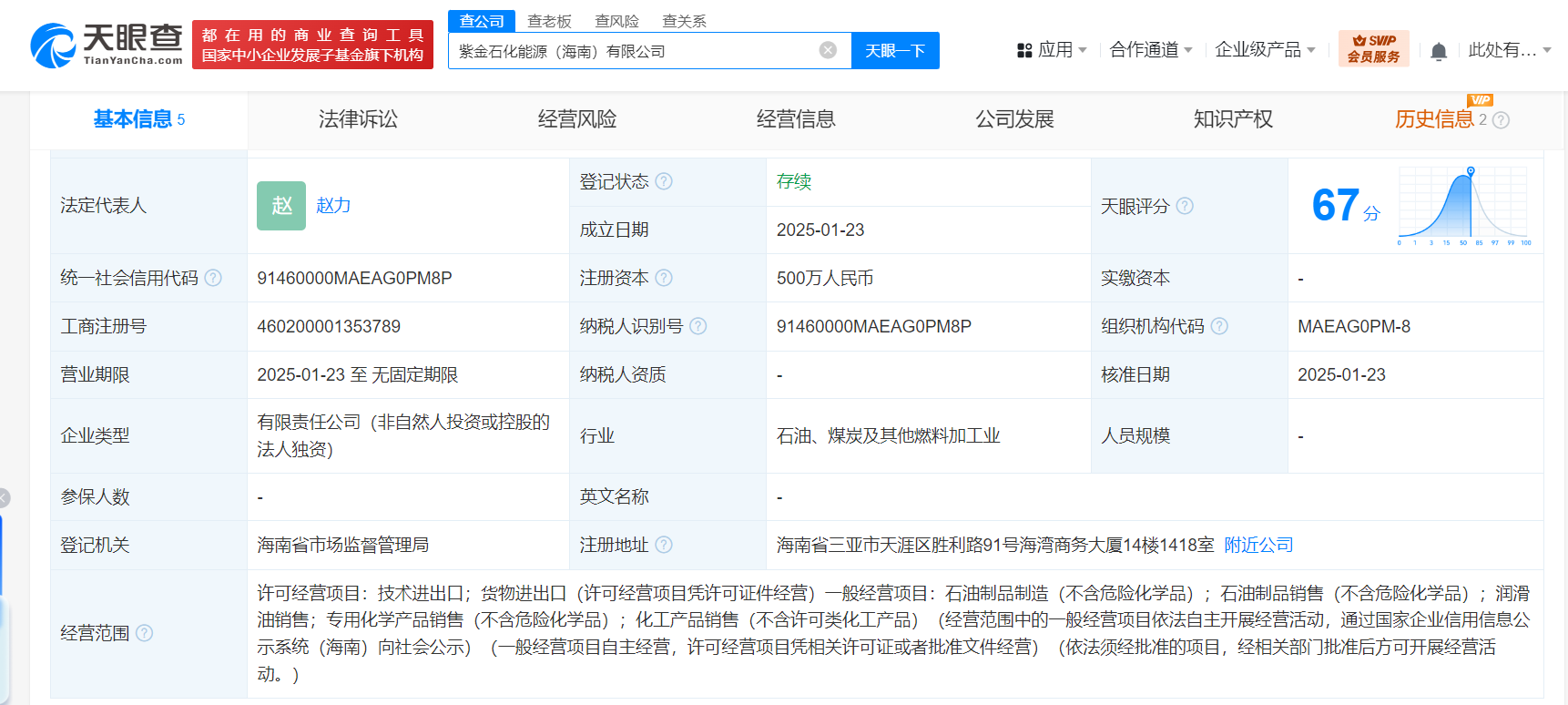 天眼查App显示,近日,紫金石化能源(海南)有限公司成立,法定代表人为赵力,注册资本500万人民币,经营范围含技术进出口、货物进出口、石油制品销售、润滑油销售、专用化学产品销售、化工产品销售等。股东信息显示,该公司由紫金矿业旗下紫金石化能源有限公司全资持股。