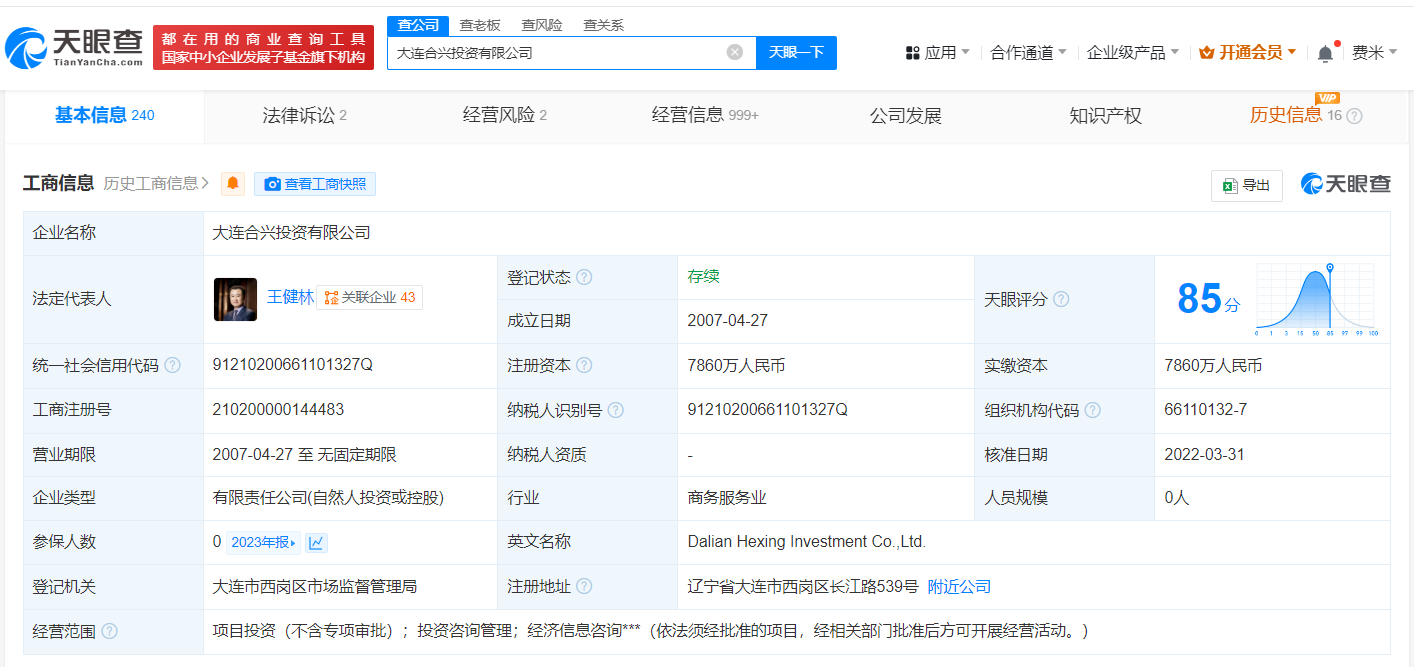 天眼查法律诉讼信息显示,近日,大连合兴投资有限公司新增一则股权冻结信息,被执行人为王健林,冻结股权数额7702.8万元人民币,股权被执行的企业为该公司,冻结期限自2025年2月11日至2027年2月10日,执行法院为大连市西岗区人民法院。