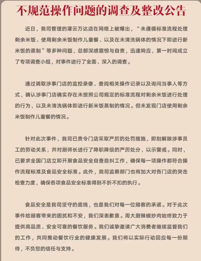 近日,周大厨连云港灌云万达店被曝光“未遵循标准流程处理剩余米饭、使用剩余米饭制作儿童餐、以及在未清洗锅体的情况下即进行新米饭的蒸制”等多种问题。2月12日,周大厨发布《不规范操作问题的调查及整改公告》回应称,总部深感震惊与自责,迅速响应,第一时间成立了专项调查小组,对事件进行了全面、深入的调查。