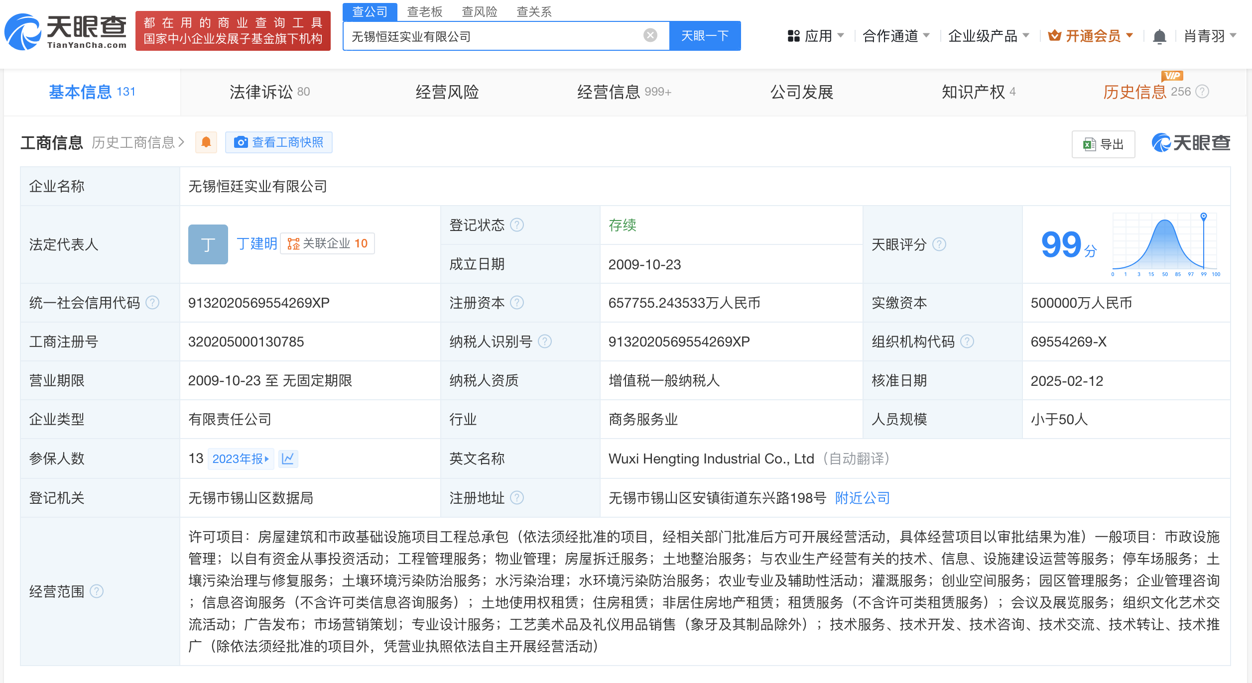 天眼查App显示,近日,无锡恒廷实业有限公司发生工商变更,注册资本由约57.5亿人民币增至约65.8亿人民币。