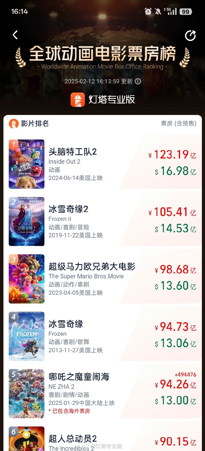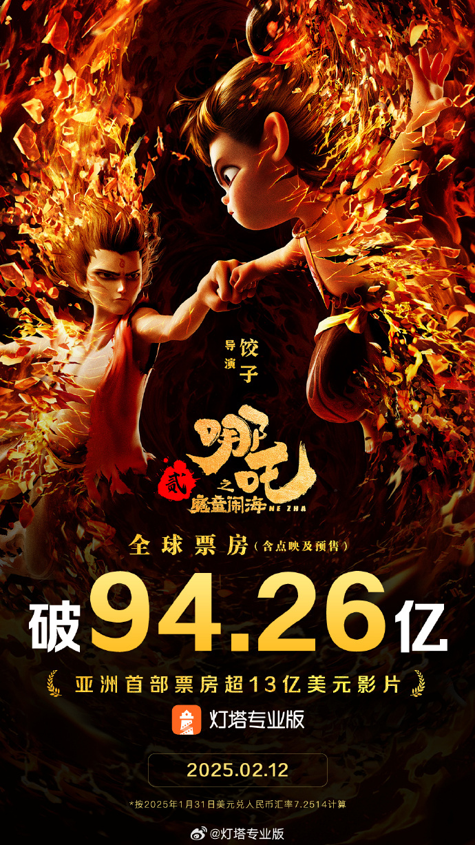 据灯塔专业版全球票房榜,截至2月12日16时14分,影片《哪吒之魔童闹海》全球票房已突破13亿美元,其中海外市场点映票房37万美元。