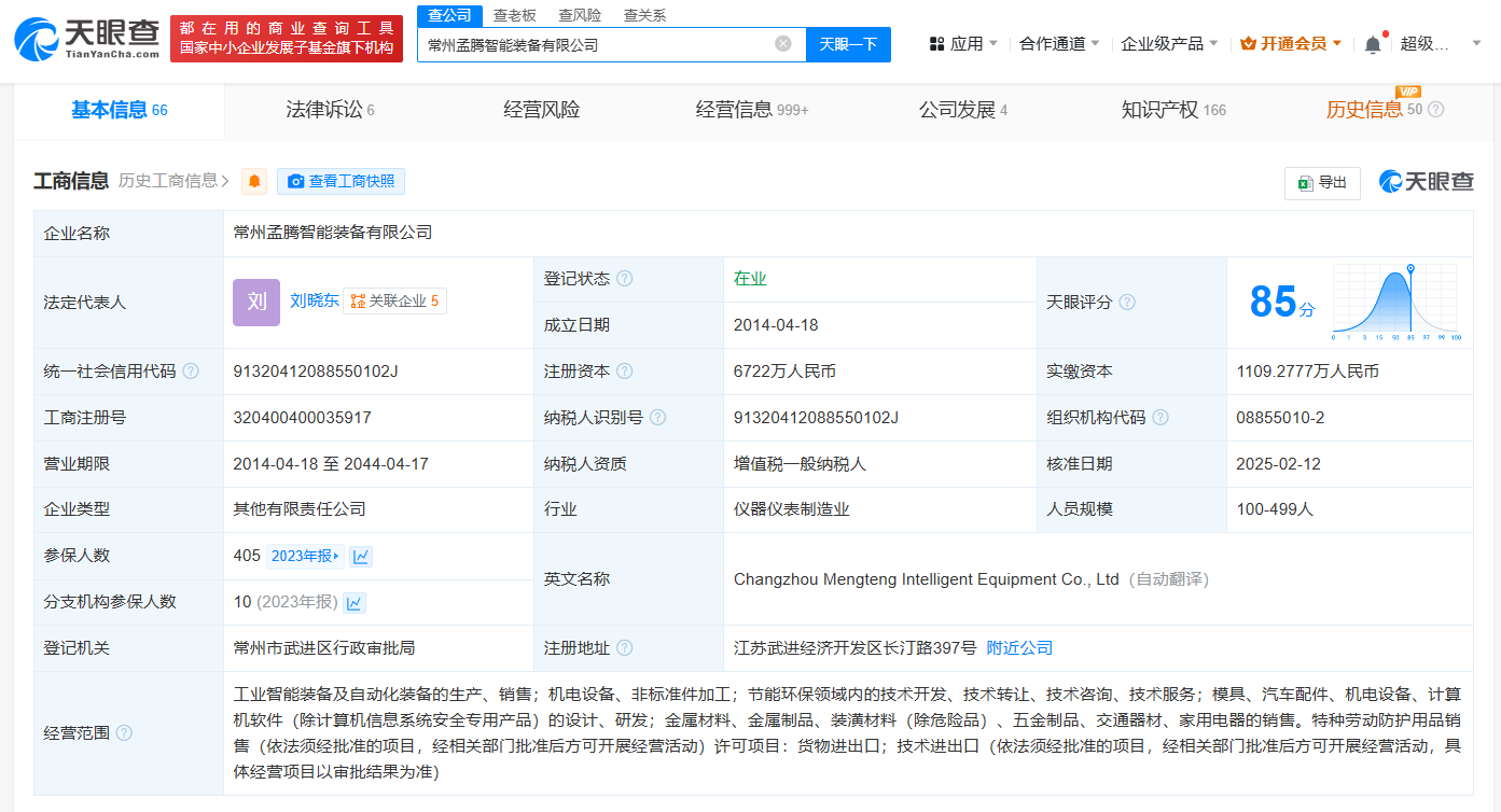 常州孟腾智能装备有限公司成立于2014年4月,法定代表人为刘晓东,注册资本6722万人民币,经营范围包括工业智能装备及自动化装备的生产、销售等,现由上海孟腾自动化科技有限公司、俞丁山等共同持股。官网显示,该公司专注于为汽车整车制造、新能源锂电、新能源汽车精密零部件等高端制造业提供数智化极限制造先进解决方案。