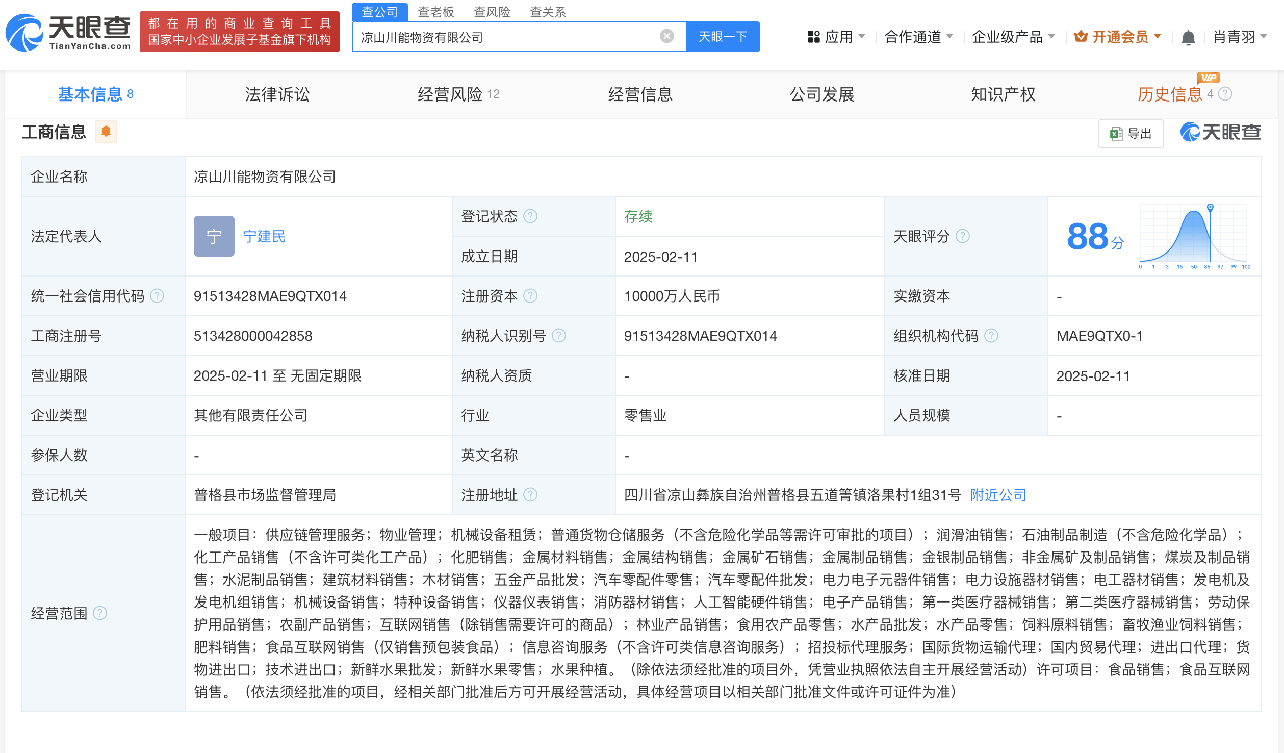 天眼查App显示,近日,凉山川能物资有限公司成立,法定代表人为宁建民,注册资本1亿人民币,经营范围包括供应链管理服务、物业管理、机械设备租赁、普通货物仓储服务、润滑油销售、石油制品制造等。股东信息显示,该公司由四川能投旗下四川能投物资产业集团有限公司、四川能投凉山生态产业投资有限公司共同持股。