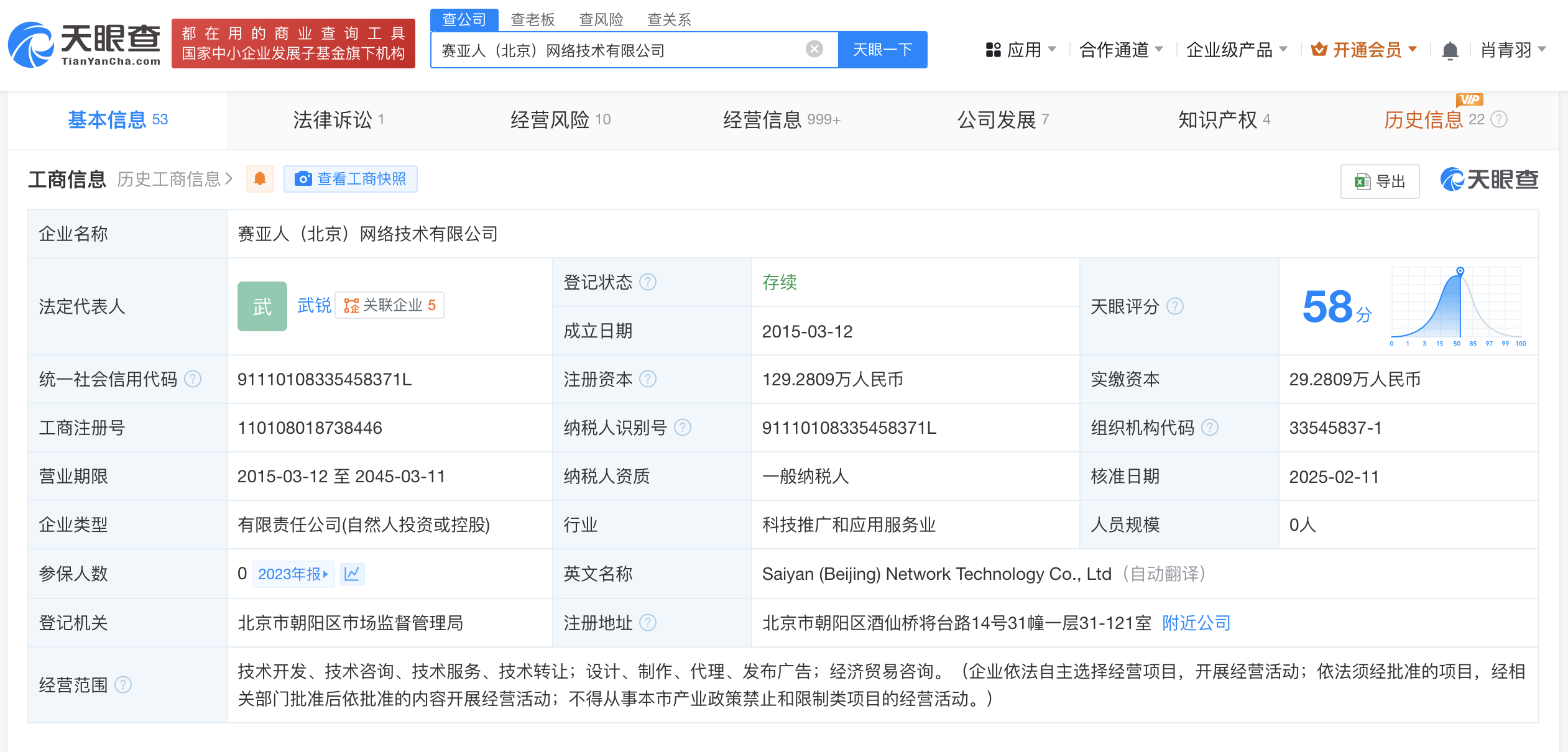 赛亚人(北京)网络技术有限公司成立于2015年3月,法定代表人为武锐,经营范围含技术开发、技术咨询、技术服务、技术转让等,现由武锐、魏晅、李虹、深圳市创梦天地科技有限公司共同持股。