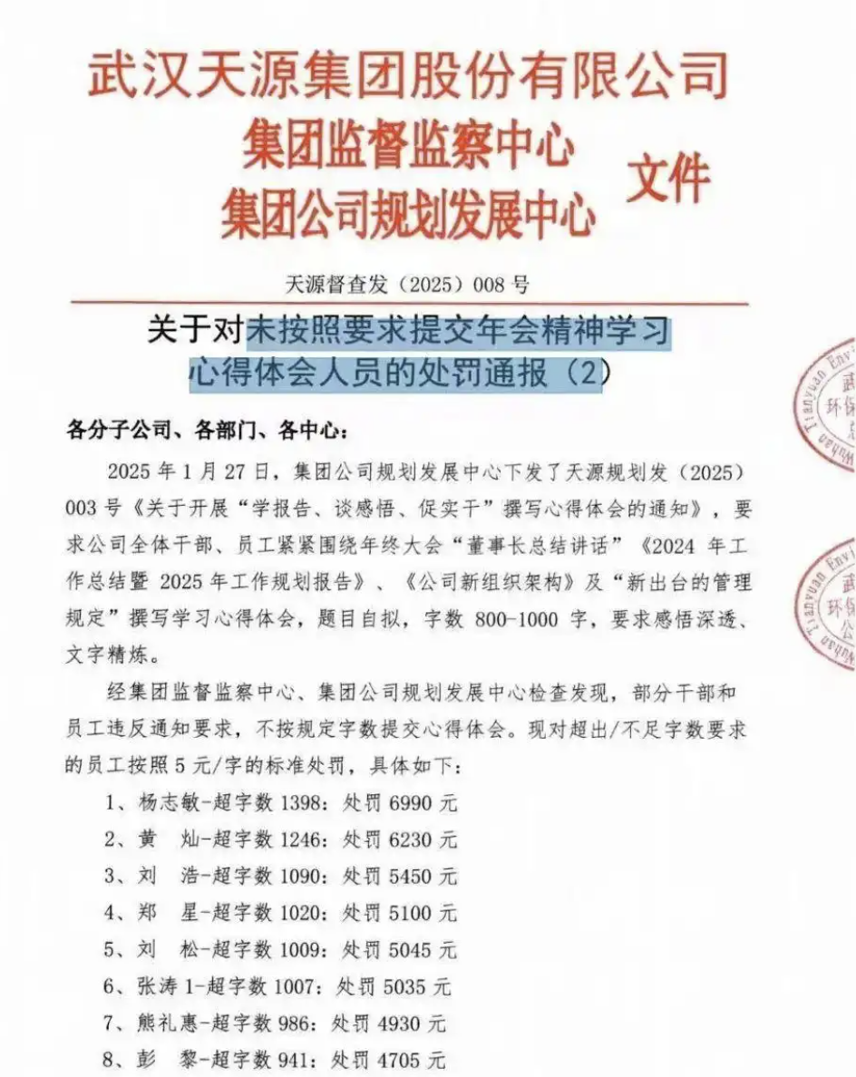 通报显示,1月27日,集团下发了《关于开展“学报告、谈感悟、促实干”撰写心得体会的通知》,要求公司全体干部员工围绕年终大会“董事长总结讲话”《2024年工作总结暨2025年工作规划报告》、《公司新组织架构》及“新出台的管理规定”撰写学习心得体会,其中提到“题目自拟,字数800-1000字,要求感悟深透、文字精炼……经集团监督监察中心、集团公司规划发展中心检查发现,部分干部和员工违反通知要求,不按规定字数提交心得体会。现对超出/不足字数要求的员工按照5元/字的标准处罚。”。