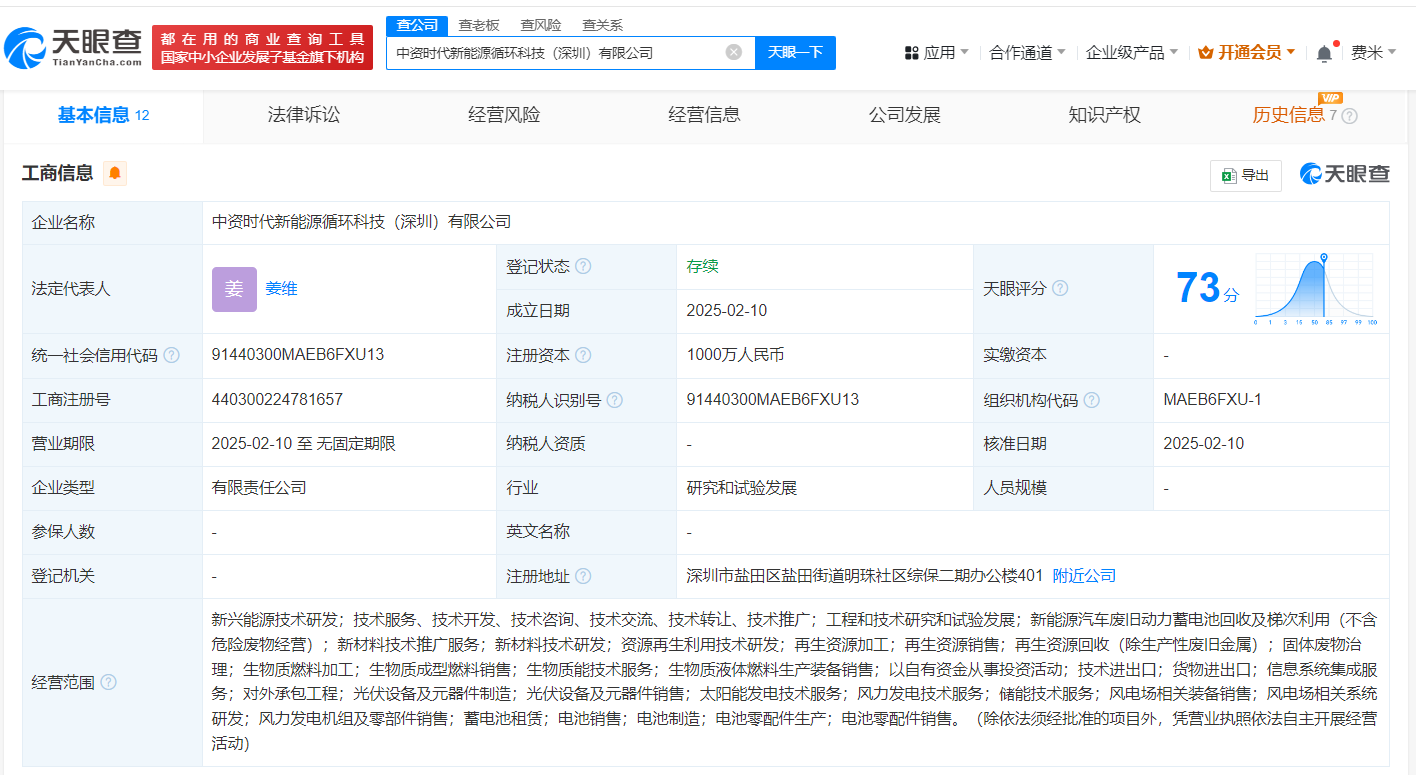 天眼查App显示,近日,中资时代新能源循环科技(深圳)有限公司成立,法定代表人为姜维,注册资本1000万人民币,经营范围含新兴能源技术研发、工程和技术研究和试验发展、新能源汽车废旧动力蓄电池回收及梯次利用、新材料技术研发、资源再生利用技术研发、固体废物治理等,由华润环保发展有限公司、广东省复欣源科技投资有限公司分别持股51%、49%。
