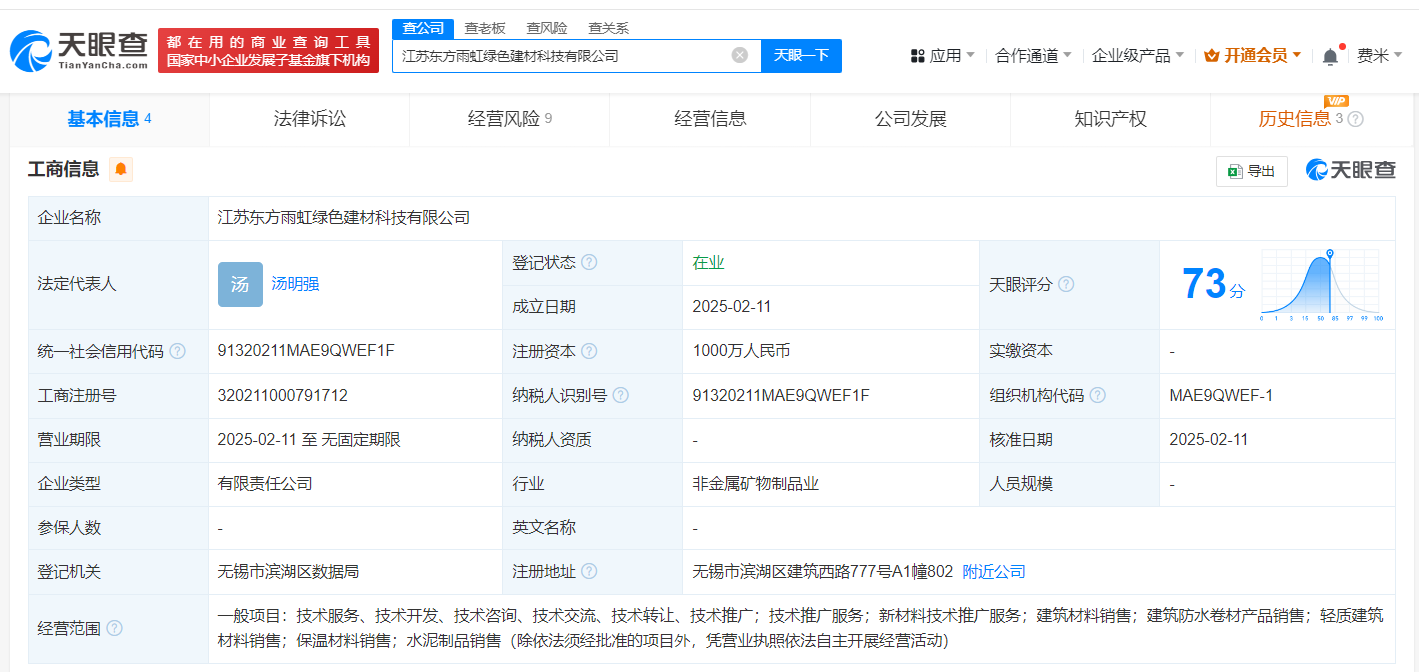 天眼查App显示,近日,江苏东方雨虹绿色建材科技有限公司成立,法定代表人为汤明强,注册资本1000万人民币,经营范围含新材料技术推广服务、建筑材料销售、建筑防水卷材产品销售、轻质建筑材料销售、保温材料销售、水泥制品销售等,由东方雨虹(002271)全资持股。
