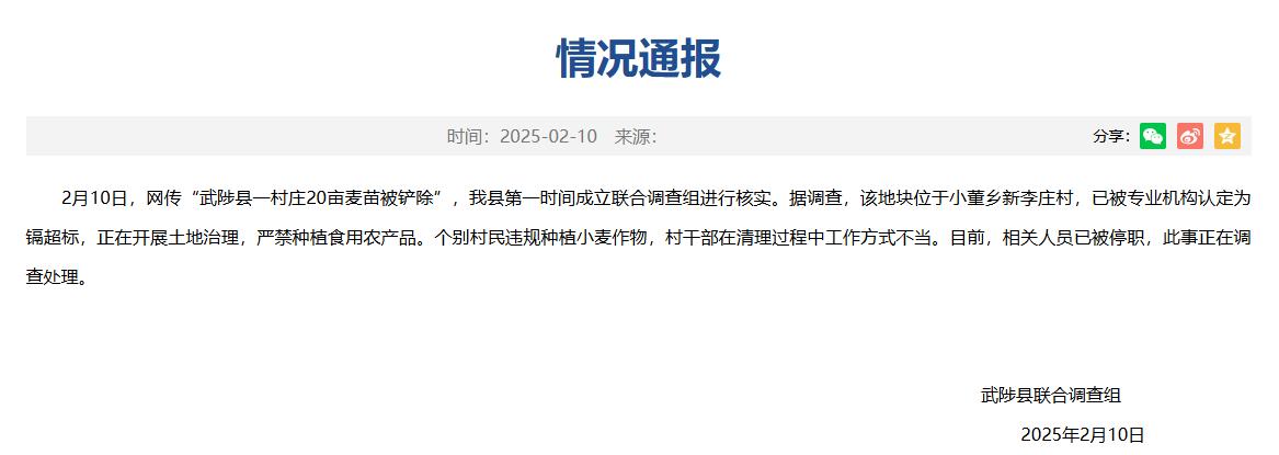 潇湘晨报记者从武陟县政府官方网站了解到,武陟县联合调查组针对上述情况已发布《情况通报》。通报称:2月10日,网传“武陟县一村庄20亩麦苗被铲除”,我县第一时间成立联合调查组进行核实。据调查,该地块位于小董乡新李庄村,已被专业机构认定为镉超标,正在开展土地治理,严禁种植食用农产品。个别村民违规种植小麦作物,村干部在清理过程中工作方式不当。目前,相关人员已被停职,此事正在调查处理。