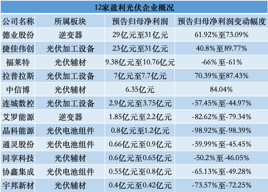 据《国际金融报》记者统计,31家出现亏损的光伏企业预告归母净利润合计亏损539.68亿元至617.58亿元;而12家录得盈利的光伏企业预告归母净利润合计达到82.49亿元至96.73亿元。