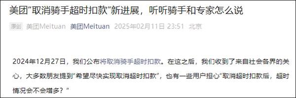 2024年12月27日,我们公布将取消骑手超时扣款。在这之后,我们收到了来自社会各界的关心,大多数朋友提到“希望尽快实现取消超时扣款”,也有一些用户担心“取消超时扣款后,超时情况会不会增多?”