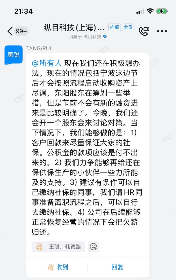 被欠薪的内部员工告诉界面新闻,2024年11月开始,每隔两周纵目科技都会召开一次全体会议维稳。到了2025年1月初,纵目有员工发现上个月的社保公积金迟迟未缴纳,公司开始有传闻称1万元的最低工资也将难以发放。1月16日的全员会议中,唐锐对此“辟谣”,并安抚员工表示,春节前仍会用客户回款发放1万元最低工资,并承诺缴纳去年12月社保公积金,称公司已在和某宁波上市公司对接业务并购事宜,被收购后会分批归还员工欠薪。