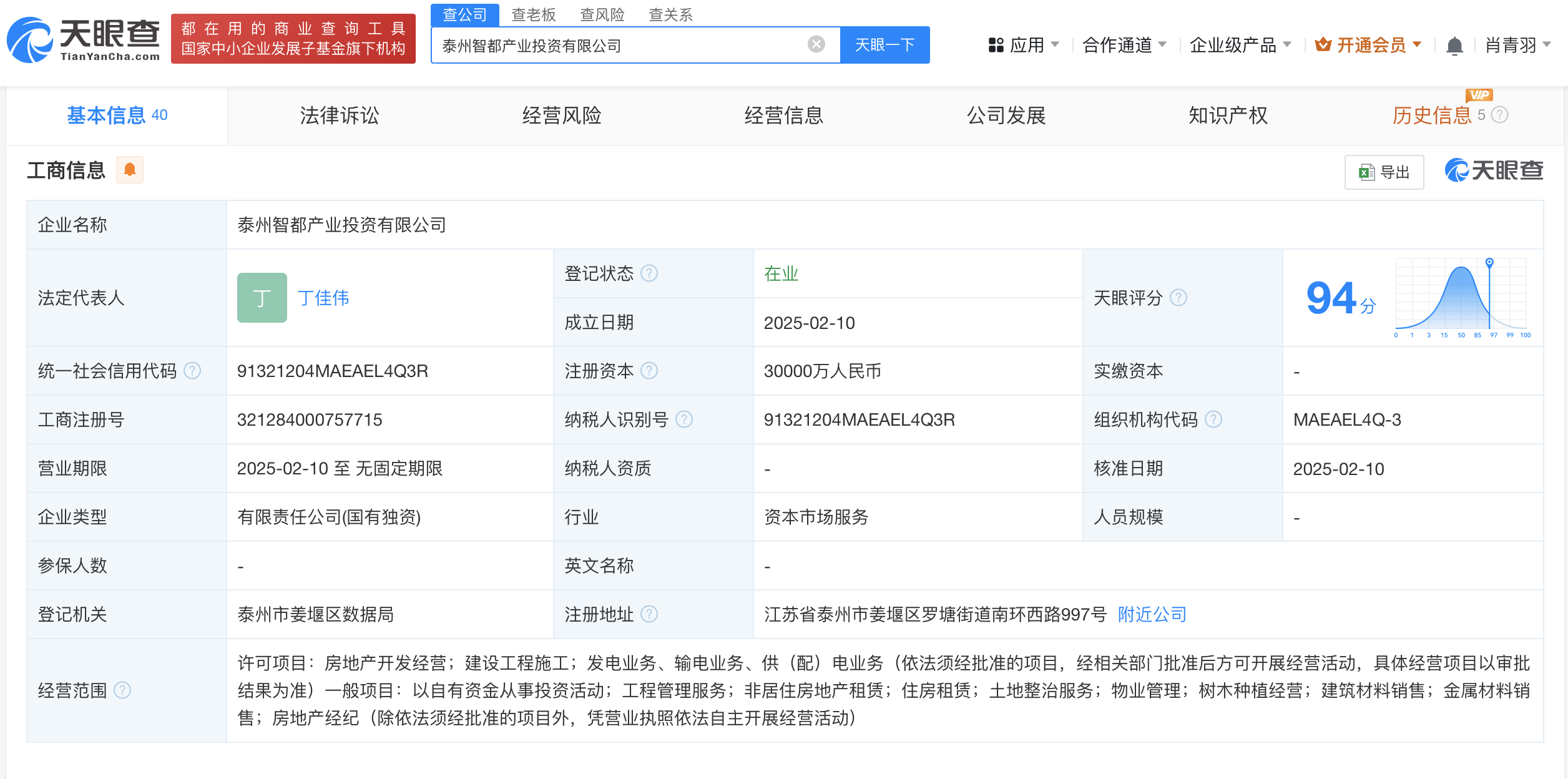 天眼查App显示,近日,泰州智都产业投资有限公司成立,法定代表人为丁佳伟,注册资本3亿人民币,经营范围包括以自有资金从事投资活动、工程管理服务、非居住房地产租赁、住房租赁、土地整治服务、物业管理等。股东信息显示,该公司由泰州市姜堰区人民政府国有资产监督管理办公室全资持股。