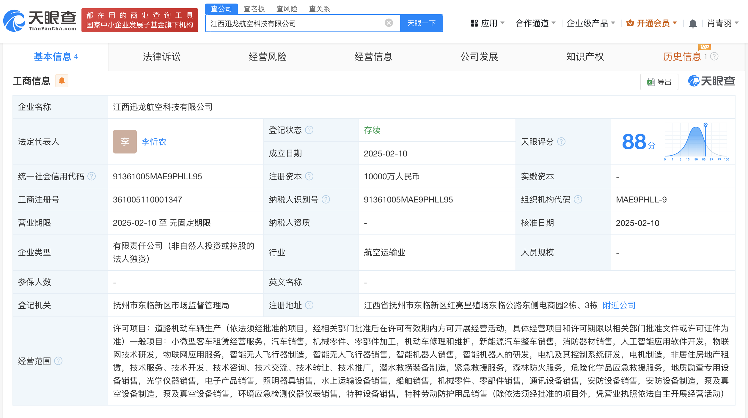 天眼查App显示,近日,江西迅龙航空科技有限公司成立,法定代表人为李忻农,注册资本1亿人民币,经营范围包括人工智能应用软件开发、物联网技术研发、物联网应用服务、智能无人飞行器制造、智能无人飞行器销售、智能机器人销售、智能机器人的研发等。股东信息显示,该公司由新余博迅汽车有限公司全资持股。