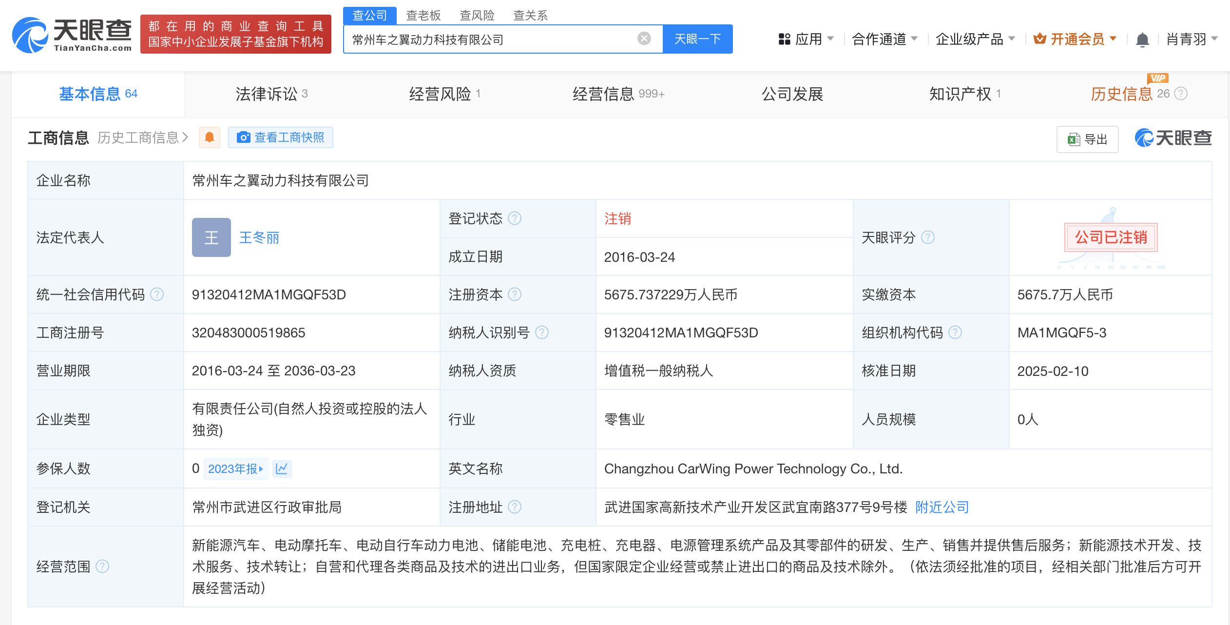 天眼查App显示,近日,常州车之翼动力科技有限公司登记状态由存续变更为注销。