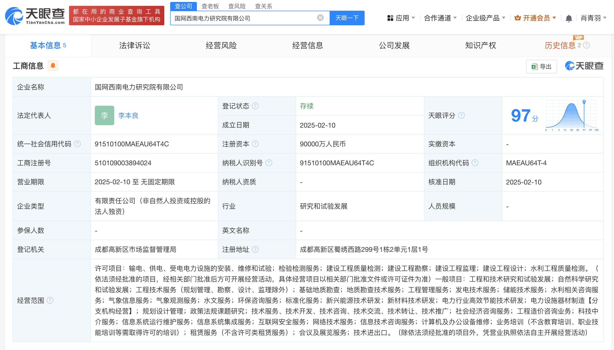 天眼查App显示,近日,国网西南电力研究院有限公司成立,法定代表人为李本良,注册资本9亿人民币,经营范围包括基础地质勘查、地质勘查技术服务、工程管理服务、发电技术服务、储能技术服务、水利相关咨询服务、气象信息服务、气象观测服务、水文服务等。股东信息显示,该公司由国家电网有限公司全资持股。