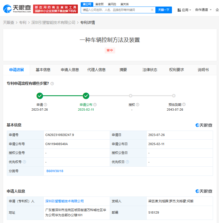 天眼查App显示,2月11日,华为旗下深圳引望智能技术有限公司申请的“一种车辆控制方法及装置”专利公布。