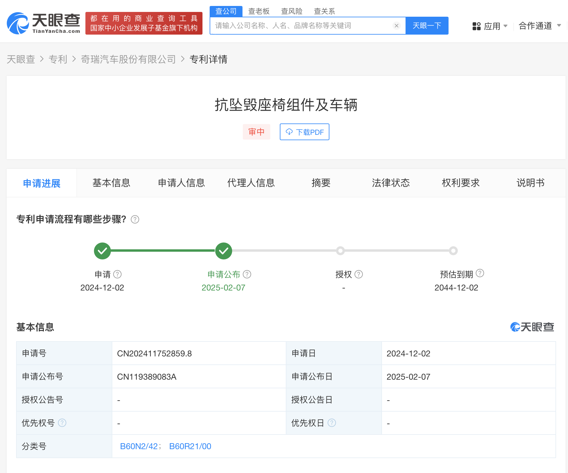 天眼查知识产权信息显示,近日,奇瑞汽车股份有限公司申请的“抗坠毁座椅组件及车辆”专利公布。