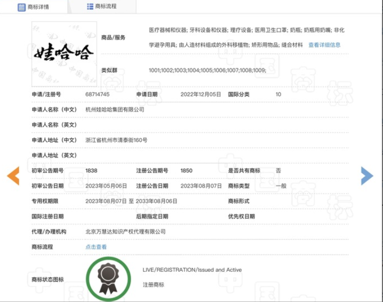 2月11日,据国家知识产权局商标局官网消息,杭州娃哈哈集团有限公司正在对“娃哈哈”商标进行转让,目前“申请收文”环节已结束,申请日期为2025年1月21日,而商标的受让主体未显示。