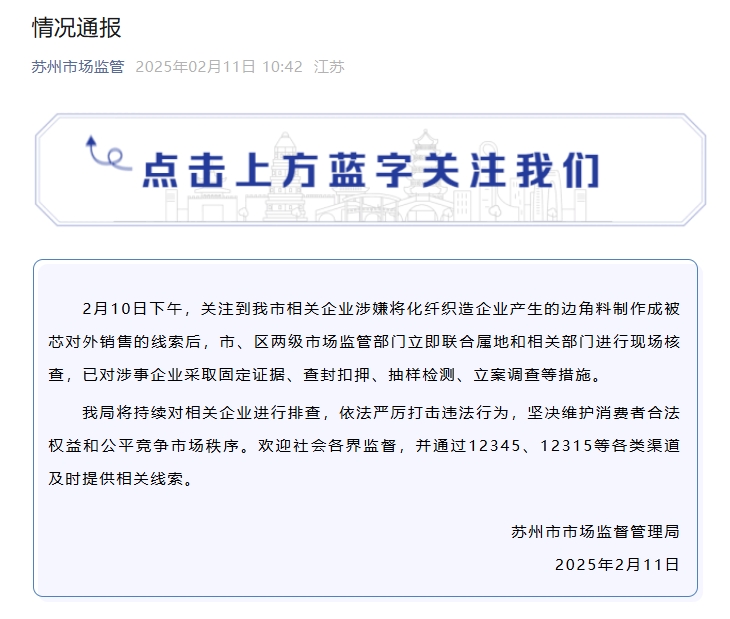 苏州市市场监督管理局11日就苏州市相关企业涉嫌将化纤织造企业产生的边角料制作成被芯对外销售的情况发布通报: