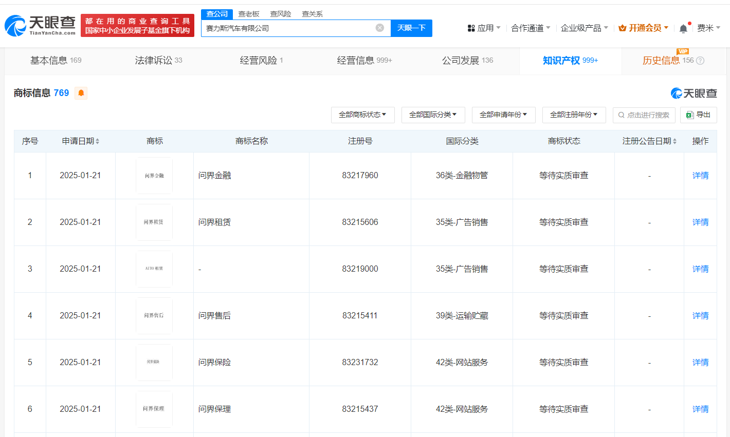 天眼查知识产权信息显示,近日,赛力斯汽车有限公司申请注册多枚“问界二手车”“问界金融”“问界售后”“问界二手车”“问界保险”等商标,国际分类包含金融物管、广告销售、运输贮藏等,当前商标状态均为等待实质审查。