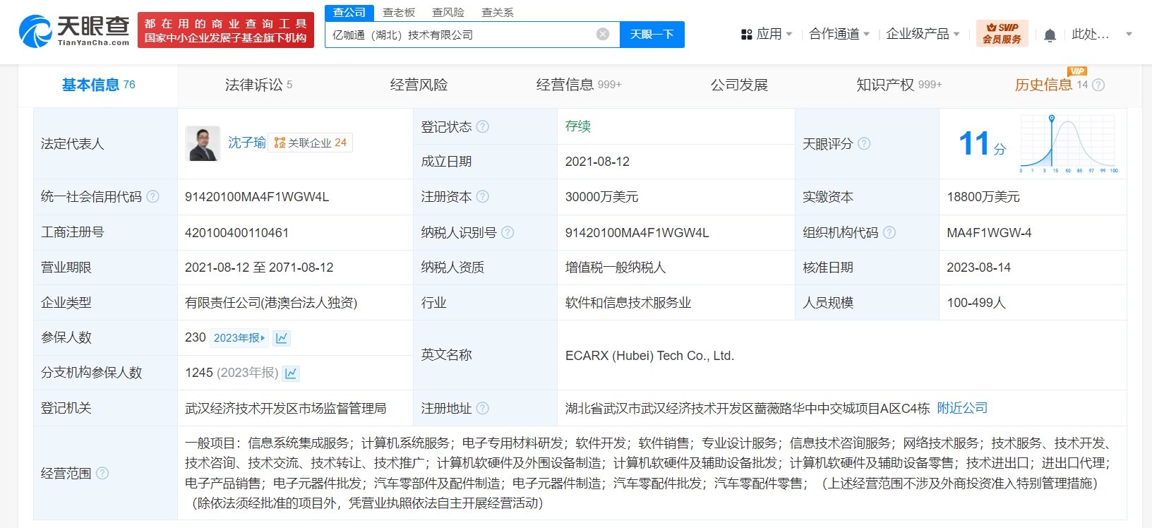 亿咖通(湖北)技术有限公司成立于2021年8月,法定代表人为沈子瑜,注册资本3亿美元,经营范围含信息系统集成服务、计算机系统服务、电子专用材料研发、软件开发、信息技术咨询服务、网络技术服务、汽车零部件及配件制造等,由ECARX Technology Limited全资持股。