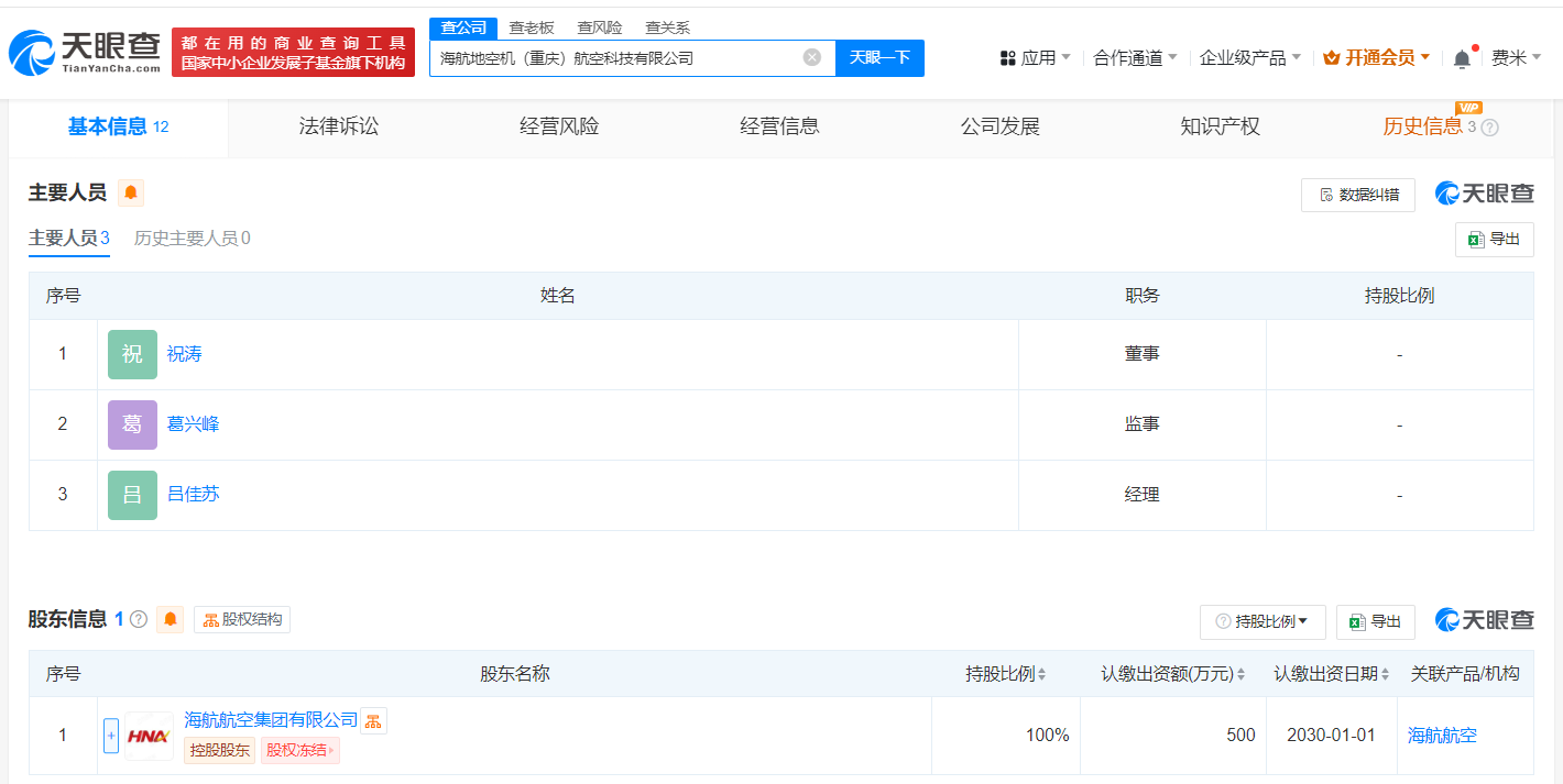 天眼查App显示,近日,海航地空机(重庆)航空科技有限公司、海航空地机(重庆)航空科技有限公司成立,法定代表人均为祝涛,注册资本均为500万人民币,经营范围含智能无人飞行器制造、智能机器人销售、工业机器人销售、人工智能硬件销售、人工智能基础软件开发、人工智能理论与算法软件开发等,上述两家公司均由海航航空集团有限公司全资持股。