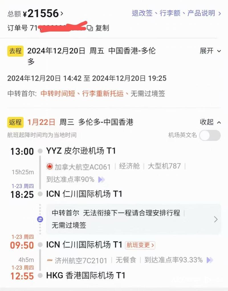 返程最初拟定的多伦多飞首尔,再从首尔转香港;但因为首尔转香港的航班提前了起飞时间,所以与之前安排的航线是衔接不上的。
