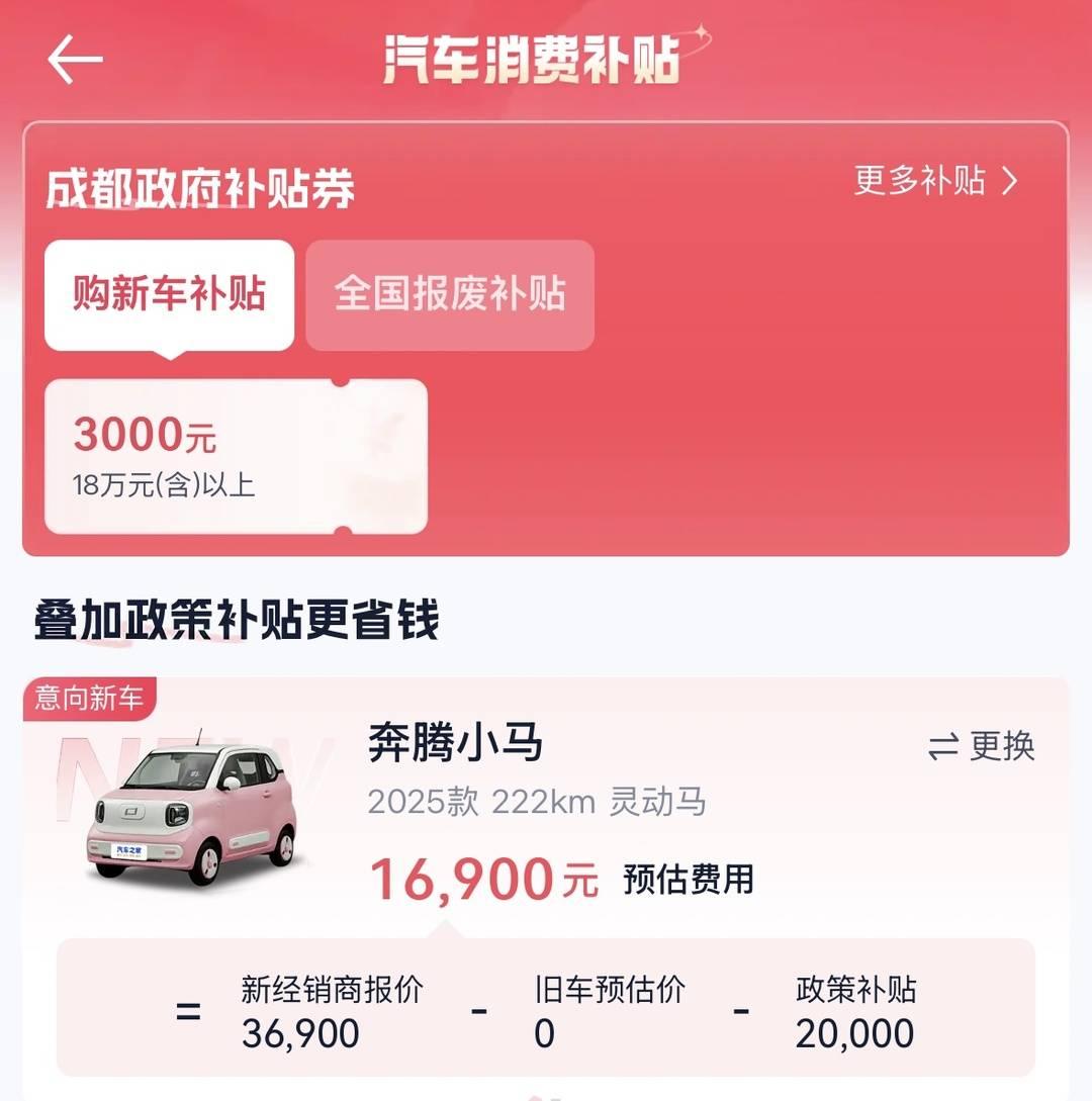 还有网友分享了截图:某汽车交易平台上,奔腾小马“2024款 122km 可爱马”,新经销商报价24900,政策补贴(全国报废补贴)20000,预估费用4900。