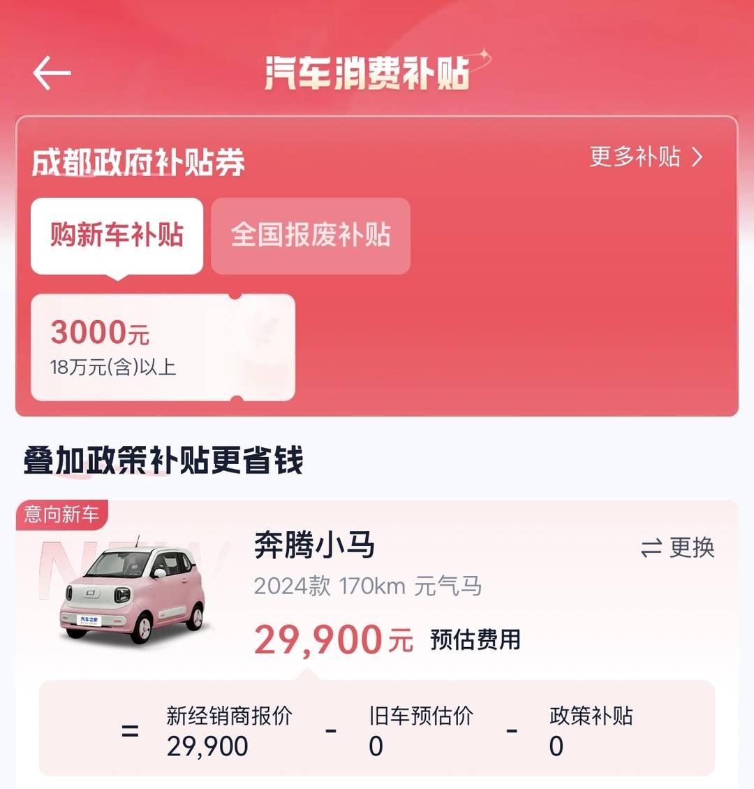 记者也在某汽车交易平台上进行了查询。查询显示,根据成都政府补贴券,“2025款 222km 灵动马”经销商报价36900元,政策补贴20000元,预估费用为16900元,但低于这款配置的“2024款 170km 元起马”就没有政府补贴,预估费用为29900元。
