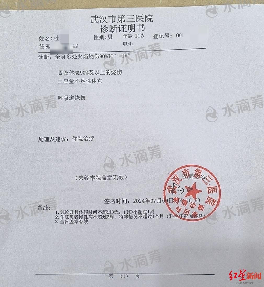 2月10日,父亲杜先生告诉红星新闻记者,爆炸后儿子的手指被截了三只,发生粘连,目前儿子手指还不能动,正在做关节训练。此外,儿子身上和脸上的疤痕也开始增生,需要做激光治疗。