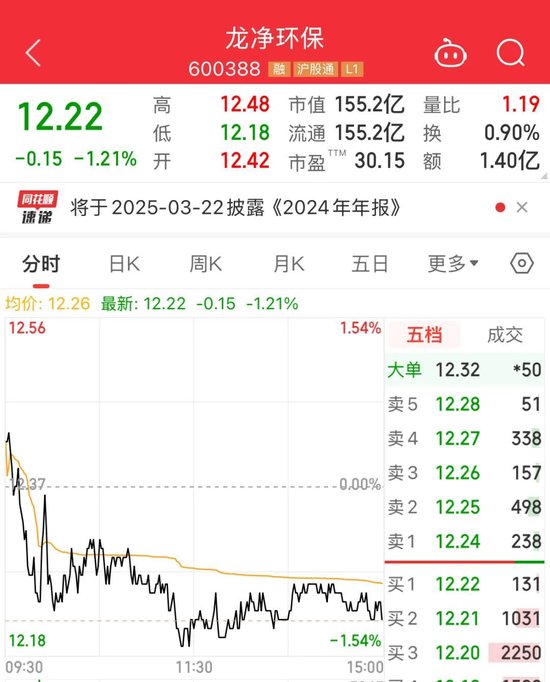 截至2月10日收盘,龙净环保股价报12.22元/股,总市值为155.2亿元。