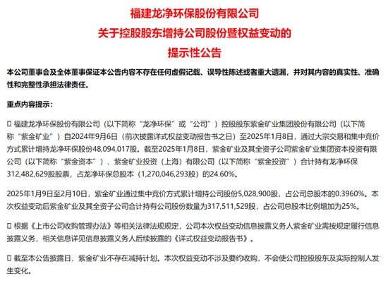 此前,自2024年9月6日至2025年1月8日,紫金矿业通过大宗交易和集中竞价方式累计增持龙净环保股份48,094,017股。截至2025年1月8日,紫金矿业及其全资子公司紫金资本、紫金投资合计持有龙净环保312,482,629股股票,占龙净环保总股本(1,270,046,293股)的24.60%。