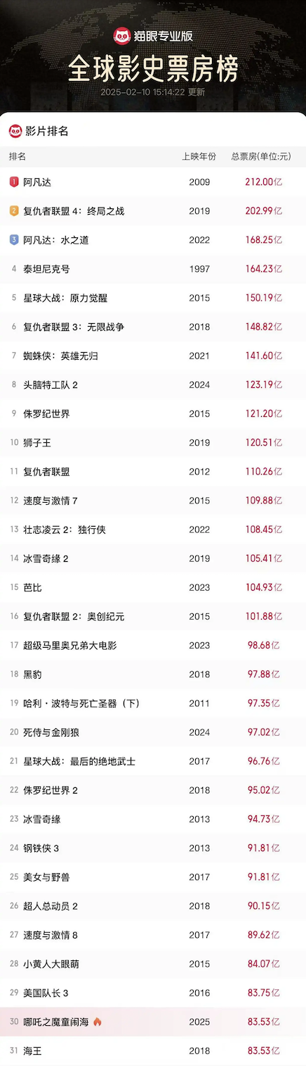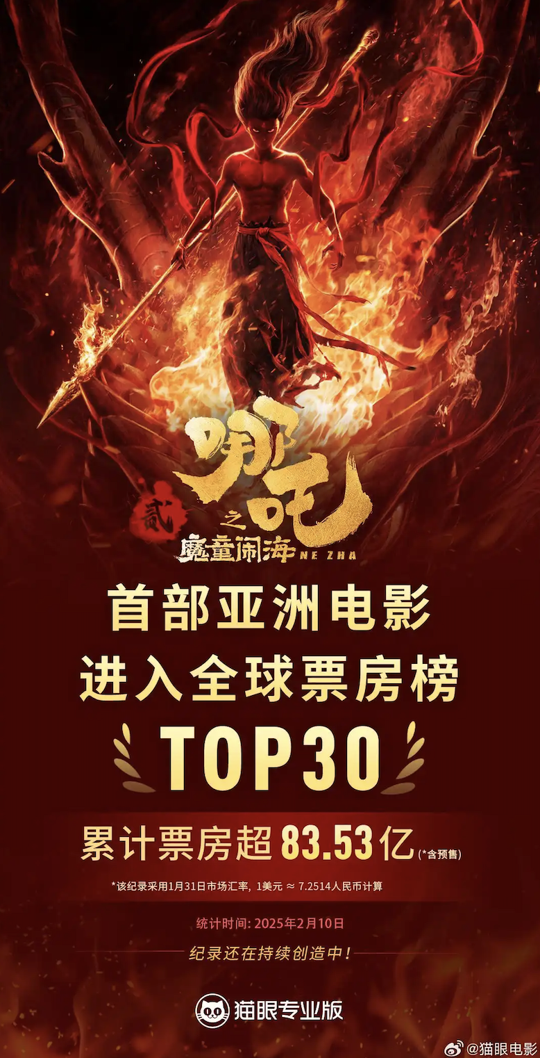 据猫眼专业版数据,《哪吒之魔童闹海》累计票房(含预售)超83.53亿,超《海王》票房成绩,成为首部进入全球票房榜前30亚洲电影!