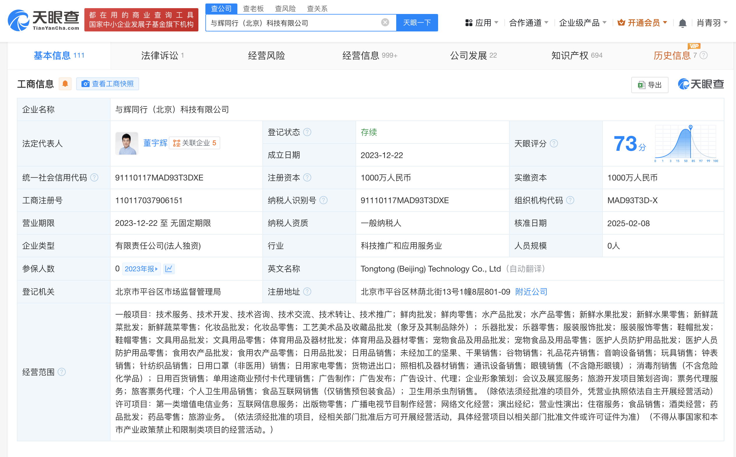 与辉同行(北京)科技有限公司成立于2023年12月,法定代表人为董宇辉,注册资本1000万人民币,经营范围包括第一类增值电信业务、互联网信息服务、出版物零售、广播电视节目制作经营、网络文化经营、演出经纪、营业性演出等。