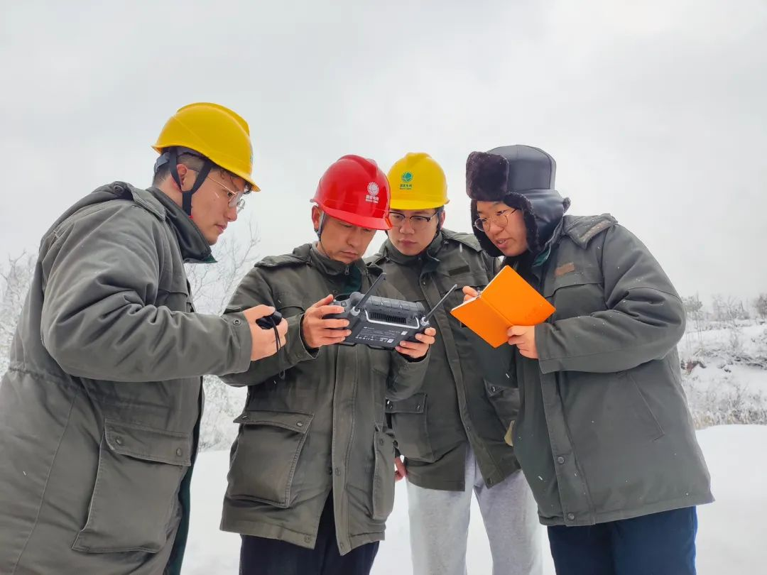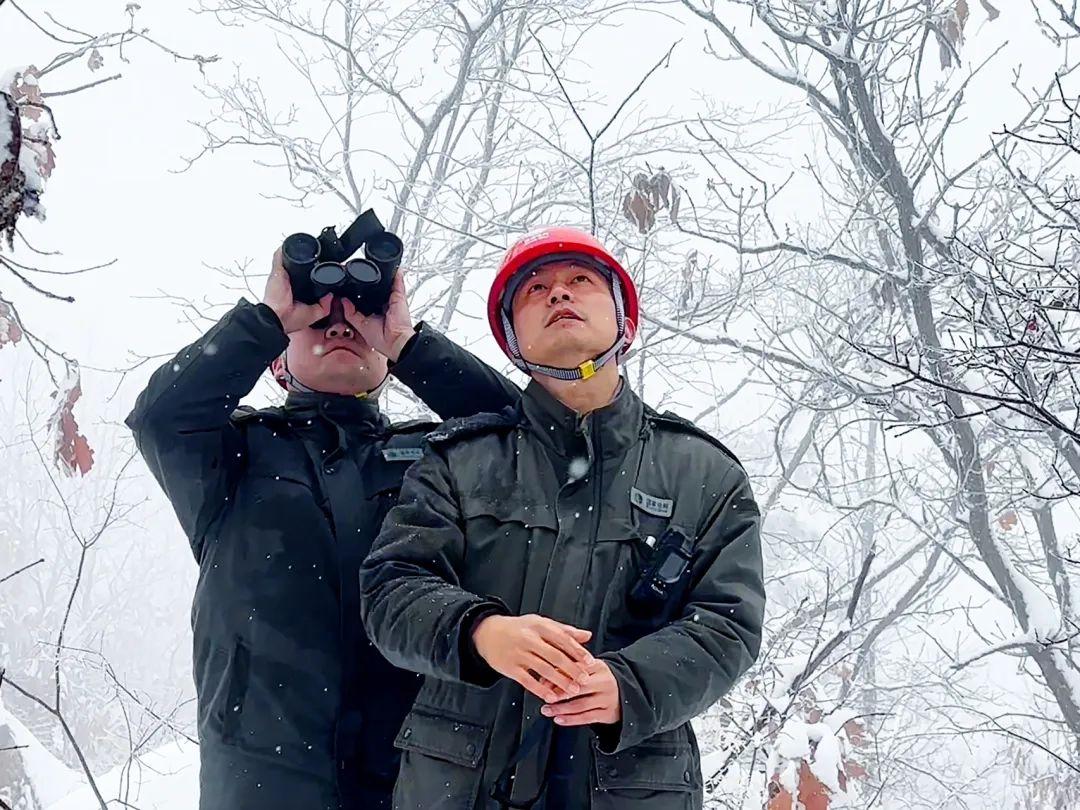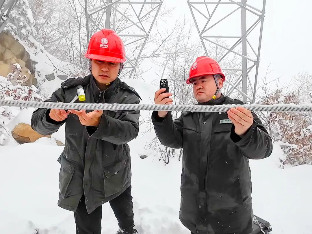 越往山顶走,气温越低。管霄和同事们不时站在蜿蜒陡峭的山坡上,使用测温仪、望远镜观测导线覆冰厚度,预判冰情发展趋势。