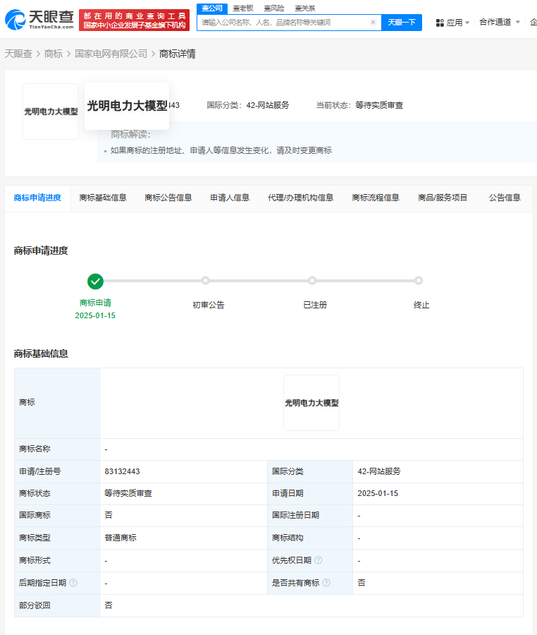 天眼查App显示,近日,国家电网有限公司申请注册多枚“光明大模型”“国家电网光明”“光明电力大模型”“光明”商标,国际分类涉及网站服务、燃料油脂、运输贮藏,当前商标状态均为等待实质审查。