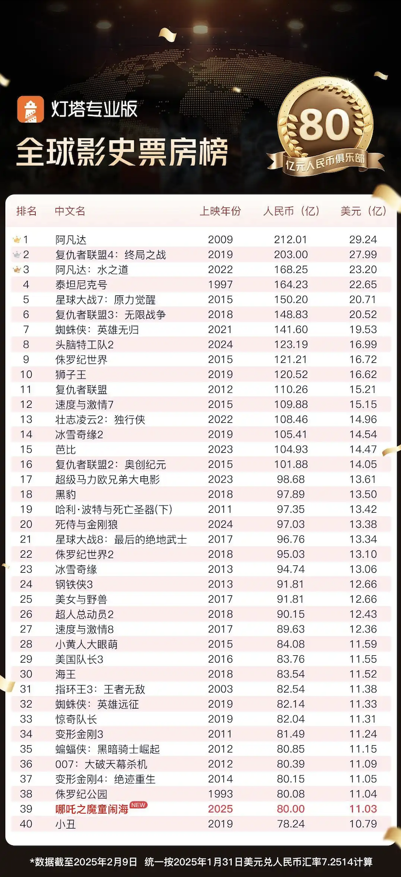 据网络平台数据,截至2月9日18时39分,影片《哪吒之魔童闹海》票房(含预售)突破80亿,成为全球影史第39部票房超过80亿(人民币)的影片,打破80亿元人民币票房俱乐部好莱坞影片垄断,由于影片还未在海外正式上映,该成绩再度刷新单一市场票房冠军纪录!